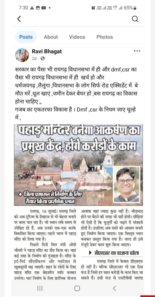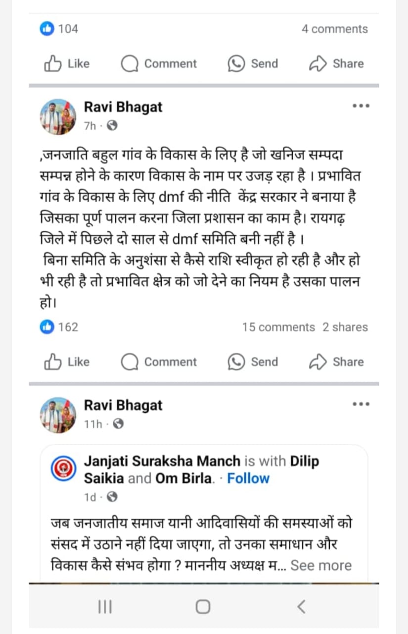 एक अन्य पोस्ट में रवि भगत लिखते हैं – “Dmf, जनजाति बहुल गांव के विकास के लिए है जो खनिज सम्पदा सम्पन्न होने के कारण विकास के नाम पर उजड़ रहा है। प्रभावित गांव के विकास के लिए dmf की नीति केंद्र सरकार ने बनाया है जिसका पूर्ण पालन करना जिला प्रशासन का काम है। रायगढ़ जिले में पिछले दो साल से dmf समिति बनी नहीं है। बिना समिति के अनुशंसा से कैसे राशि स्वीकृत हो रही है और हो भी रही है तो प्रभावित क्षेत्र को जो देने का नियम है उसका पालन हो।
