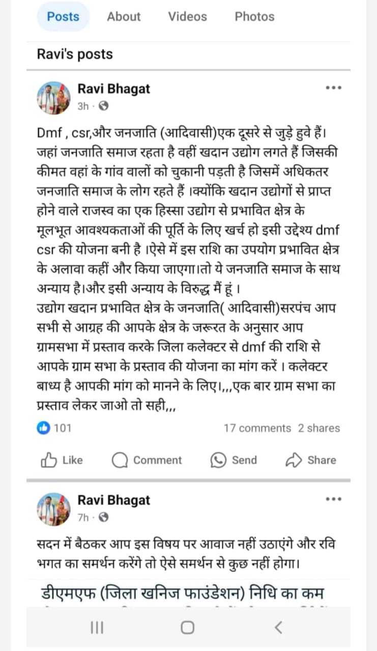 रवि भगत एक अन्य पोस्ट में लिखते हैं – “Dmf, csr, और जनजाति (आदिवासी) एक दूसरे से जुड़े हुए हैं। जहां जनजाति समाज रहता है वहीं खदान उद्योग लगते हैं जिसकी कीमत वहां के गांव वालों को चुकानी पड़ती है जिसमें अधिकतर जनजाति समाज के लोग रहते हैं। क्योंकि खदान उद्योगों से प्राप्त होने वाले राजस्व का एक हिस्सा उद्योग से प्रभावित क्षेत्र के मूलभूत आवश्यकताओं की पूर्ति के लिए खर्च हो इसी उद्देश्य dmf csr की योजना बनी है। ऐसे में इस राशि का उपयोग प्रभावित क्षेत्र के अलावा कहीं और किया जाएगा। तो ये जनजाति समाज के साथ अन्याय है। और इसी अन्याय के विरुद्ध मैं हूं। उद्योग खदान प्रभावित क्षेत्र के जनजाति (आदिवासी) सरपंच आप सभी से आग्रह की आपके क्षेत्र के जरूरत के अनुसार आप ग्रामसभा में प्रस्ताव करके जिला कलेक्टर से dmf की राशि से आपके ग्राम सभा के प्रस्ताव की योजना का मांग करें। कलेक्टर बाध्य है आपकी मांग को मानने के लिए।,,, एक बार ग्राम सभा का प्रस्ताव लेकर जाओ तो सही,,,!”