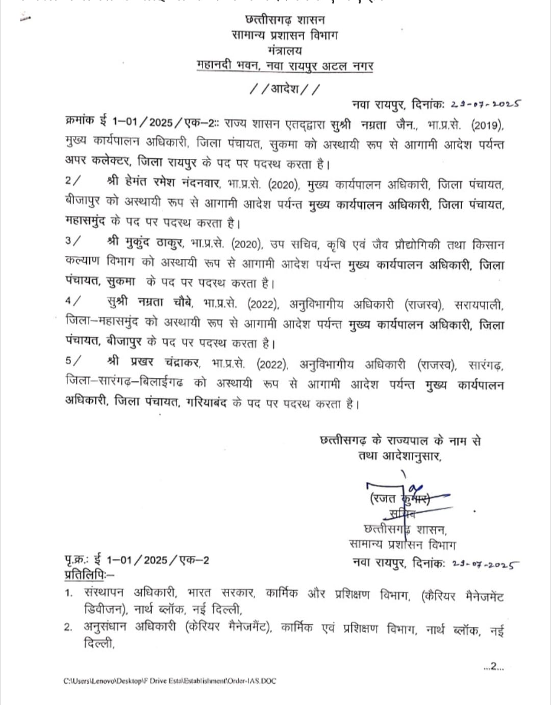 रायपुर । छत्तीसगढ़ सरकार ने भारतीय प्रशासनिक सेवा (IAS) के 5 अधिकारियों का तबादला किया है। इन बदलावों के तहत विभिन्न जिलों में जिला पंचायतों और प्रशासनिक पदों पर नई नियुक्तियां की गई हैं।