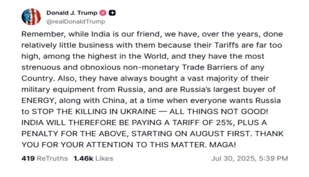 याद रखिए, भले ही भारत हमारा दोस्त है, लेकिन सालों से हमने उनके साथ बहुत कम कारोबार किया है क्योंकि वहां के टैरिफ (आयात शुल्क) बहुत ज्यादा हैं, दुनिया में सबसे ज्यादा में से एक और उनके पास ऐसे सख्त और परेशान करने वाले गैर-आर्थिक ट्रेड बैरियर्स (व्यापार अवरोध) हैं, जो किसी भी देश में सबसे मुश्किल माने जाते हैं. इसके अलावा, भारत हमेशा से अपनी ज़्यादातर सैन्य चीज़ें रूस से ही खरीदता आया है और चीन के साथ मिलकर रूस से सबसे ज्यादा ऊर्जा भी वही लेता है. ऐसे समय में जब सब चाहते हैं कि रूस यूक्रेन में मारकाट बंद करे. ये सब बातें अच्छी नहीं हैं! इसलिए अब भारत को 1 अगस्त से 25% का टैरिफ देना होगा, और ऊपर से इन वजहों के लिए एक पेनल्टी भी लगेगी. इस बात पर ध्यान देने के लिए धन्यवाद.