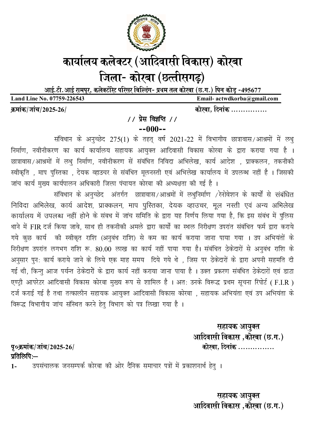 बता दें कि संविधान के अनुच्छेद अंतर्गत छात्रावास/आश्रमों में लधुनिर्माण / रेनोवेशन के कार्यों से संबंधित निविदा अभिलेख, कार्य आदेश, प्राक्कलन, माप पुस्तिका, देयक व्हाउचर, मूल नस्ती एवं अन्य अभिलेख कार्यालय में उपलब्ध नहीं होने के संबध में जांच समिति के द्वारा यह निर्णय लिया गया है, कि इस संबंध में पुलिस थाने में FIR दर्ज किया जावे, साथ ही तकनीकी अमले द्वारा कार्यों का स्थल निरीक्षण उपरांत संबंधित फर्म द्वारा कराये गये कुछ कार्य की स्वीकृत राशि (अनुबंध राशि) से कम का कार्य कराया जाना पाया गया। उप अभियंतों के निरीक्षण उपरांत लगभग राशि रू. 80.00 लाख का कार्य नहीं पाया गया है। संबंधित ठेकेदारों से अनुबंध राशि के अनुसार पुनः कार्य कराये जाने के लिये एक माह समय दिये गये थे जिस पर ठेकेदारों के द्वारा अपनी सहमति दी गई थी, किन्तु आज पर्यन्त ठेकेदारों के द्वारा कार्य नहीं कराया जाना गाया है। उक्त प्रकरण संबंधित ठेकेदारों एवं डाटा एण्ट्री आपरेटर आदिवासी विकास कोरबा मुख्य रूप से शामिल है। अतः उनके विरूद्ध प्रथम सूचना रिपोर्ट (F.I.R) दर्ज कराई गई है तथा तत्कालीन सहायक आयुक्त आदिवासी विकास कोरबा सहायक अभियंता एवं उप अभियंता के विरूद्ध विभागीय जांच संस्थित करने हेतु विभाग को पत्र लिखा गया है।