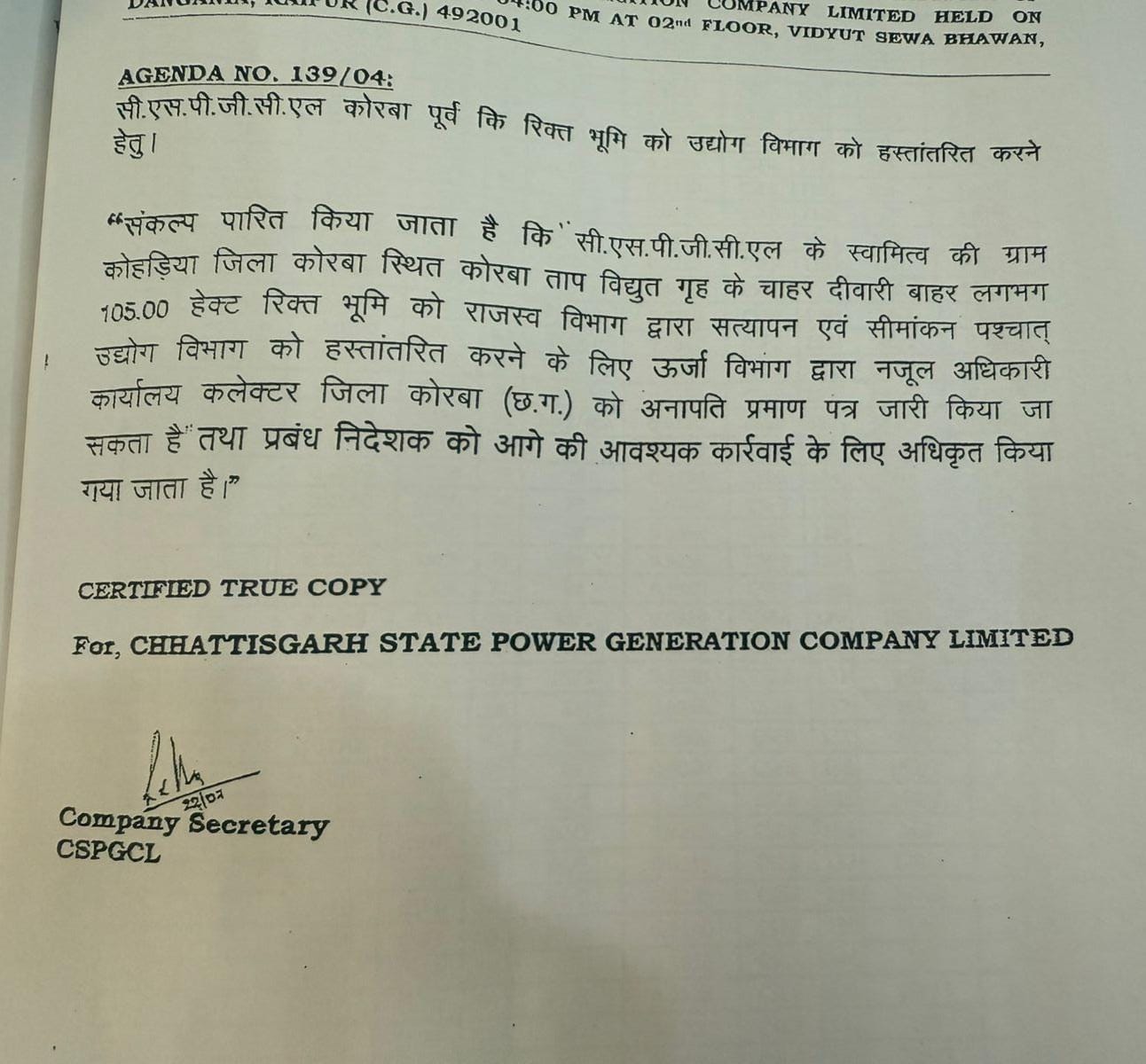 कोहड़िया स्थित कोरबा ताप विद्युत गृह की 105 हेक्टेयर ज़मीन उद्योग विभाग को अब जल्द हस्तांतरित की जाएगी। इसके लिए बोर्ड ने प्रबंध निदेशक को अधिकृत किया है। साथ ही जिला प्रशासन, नजुल, राजस्व विभाग को ज़मीन का सत्यापन एवं सीमांकन कर उद्योग विभाग को हस्ताँतरित करने के लिए ऊर्जा विभाग द्वारा नजूल अधिकारी को पत्र जारी किया गया है।