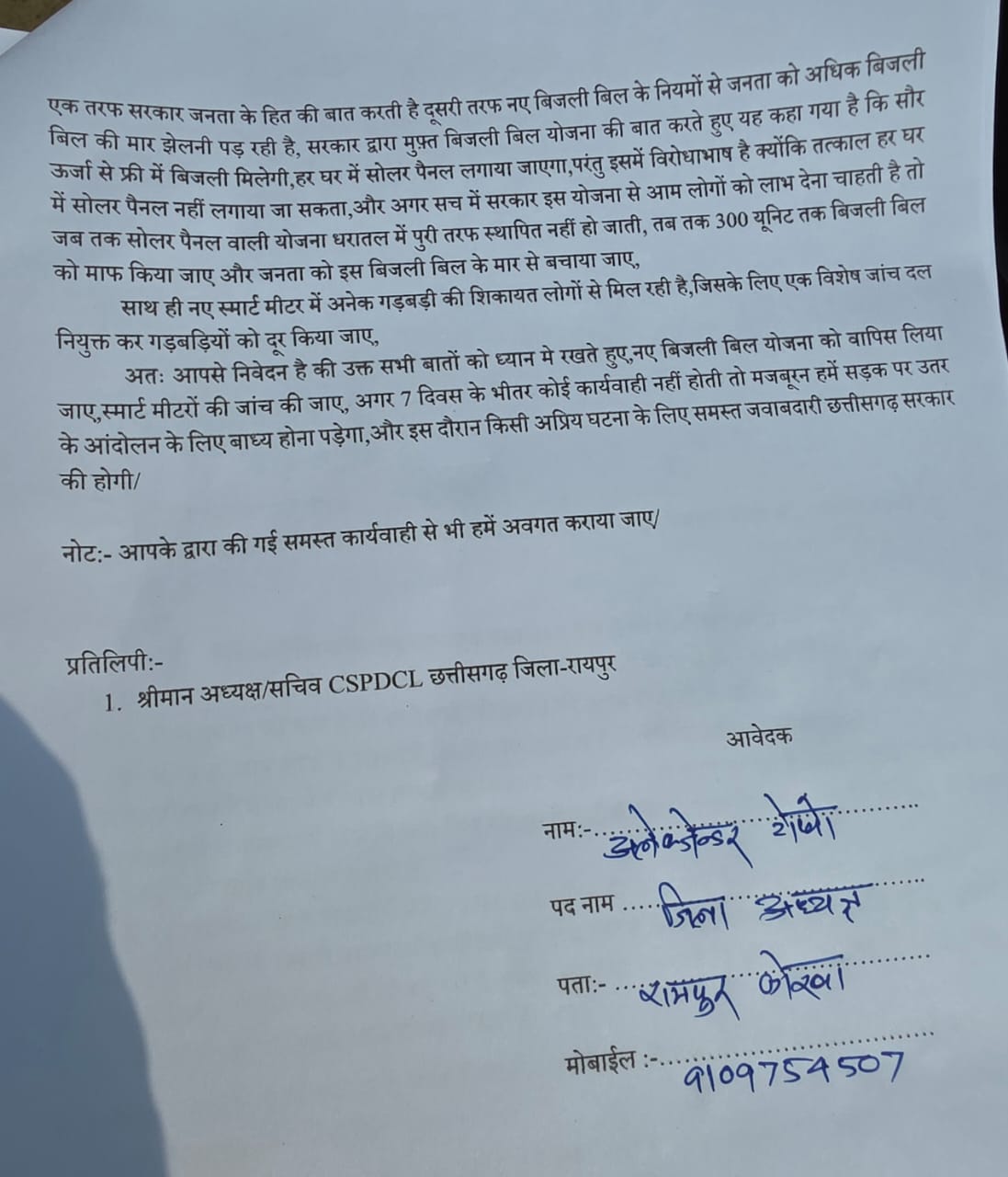 अतः आपसे निवेदन है की उक्त सभी बातों को ध्यान मे रखते हुए, नए बिजली बिल योजना को वापिस लिया जाए, स्मार्ट मीटरों की जांच की जाए, अगर 7 दिवस के भीतर कोई कार्यवाही नहीं होती तो मजबूरन हमें सड़क पर उतर के आंदोलन के लिए बाध्य होना पड़ेगा, और इस दौरान किसी अप्रिय घटना के लिए समस्त जवाबदारी छत्तीसगढ़ सरकार की होगी/