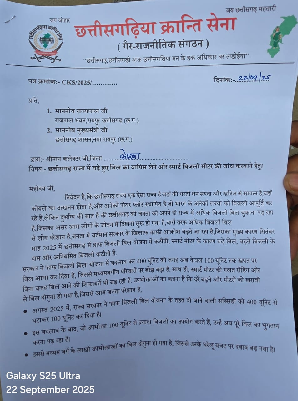 कोरबा। प्रदेश में बिजली दरों में बढोत्तरी एवं स्मार्ट मीटर से उत्पन्न विसंगति ,अनियमितता से आमजनता आहत है। संकट की इस घड़ी में छत्तीसगढ़िया क्रांति सेना