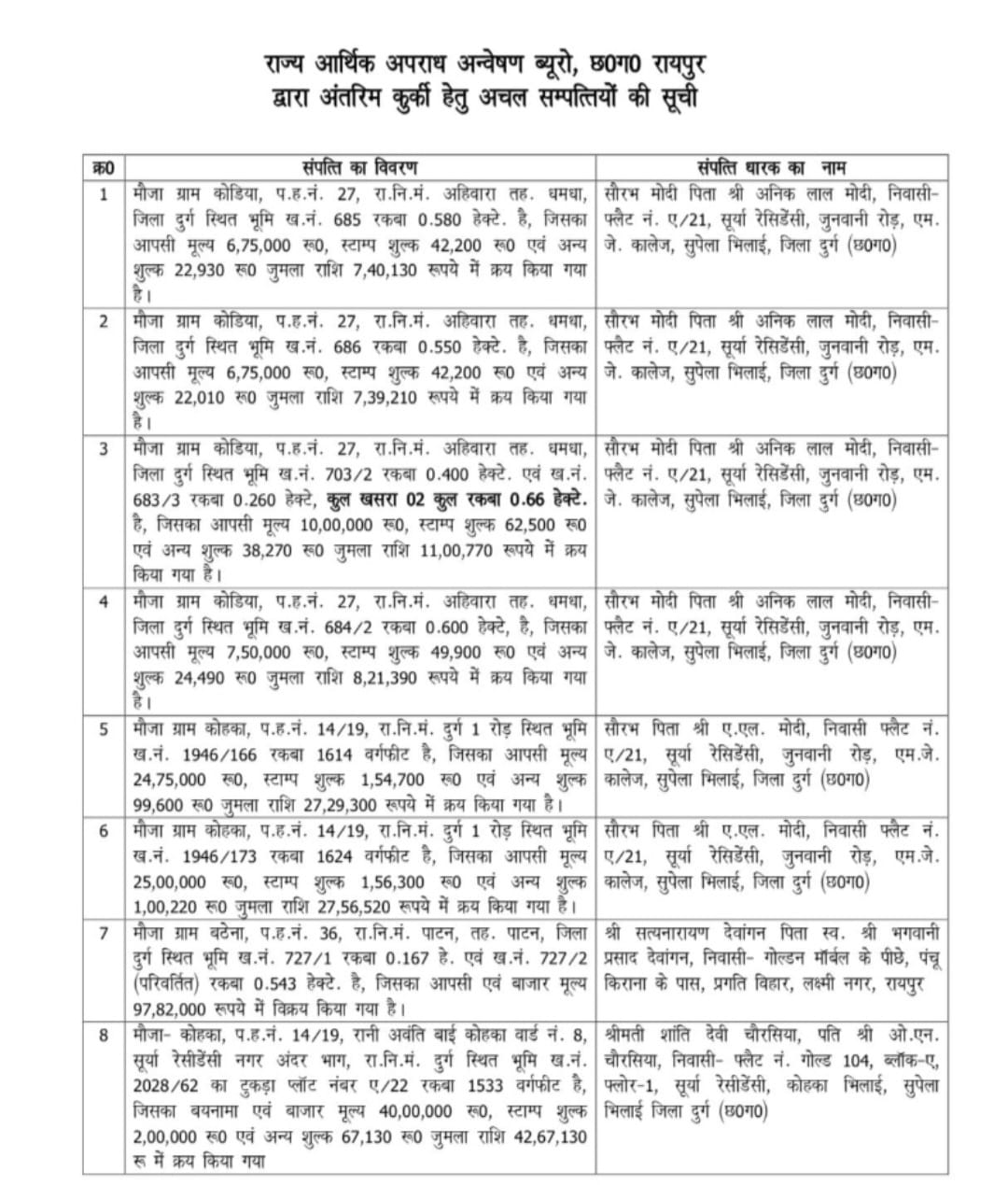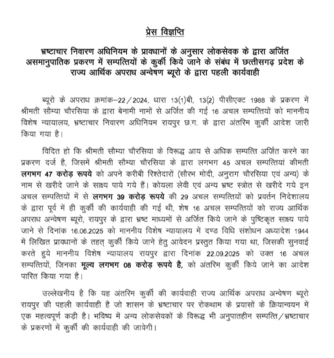 विदित हो कि श्रीमती सौम्या चौरसिया के विरूद्ध आय से अधिक सम्पत्ति अर्जित करने का प्रकरण दर्ज है, जिसमें श्रीमती सौम्या चौरसिया के द्वारा लगभग 45 अचल सम्पत्तियां कीमती लगभग 47 करोड़ रूपये को अपने करीबी रिश्तेदारों (सौरभ मोदी, अनुराग चौरसिया एवं अन्य) के नाम से खरीदे जाने के साक्ष्य पाये गये हैं। कोयला लेवी एवं अन्य भ्रष्ट स्त्रोत से खरीदे गये इन अचल सम्पत्तियों में से लगभग 39 करोड़ रूपये की 29 अचल सम्पत्तियों को प्रवर्तन निदेशालय के द्वारा पूर्व में ही कुर्की की कार्यवाही की गई थी, शेष 16 अचल सम्पत्तियों को राज्य आर्थिक अपराध अन्वेषण ब्यूरो, रायपुर के द्वारा भ्रष्ट माध्यमों से अर्जित किये जाने के पुष्टिकृत साक्ष्य पाये जाने से दिनांक 16.06.2025 को माननीय विशेष न्यायालय में दण्ड विधि संशोधन अध्यादेश 1944 में लिखित प्रावधानों के तहत् कुर्की किये जाने हेतु आवेदन प्रस्तुत किया गया था, जिसकी सुनवाई करते हुये माननीय विशेष न्यायालय रायपुर द्वारा दिनांक 22.09.2025 को उक्त 16 अचल सम्पत्तियों, जिनका मूल्य लगभग 08 करोड़ रूपये है, को अंतरिम कुर्की किये जाने का आदेश पारित किया गया है।