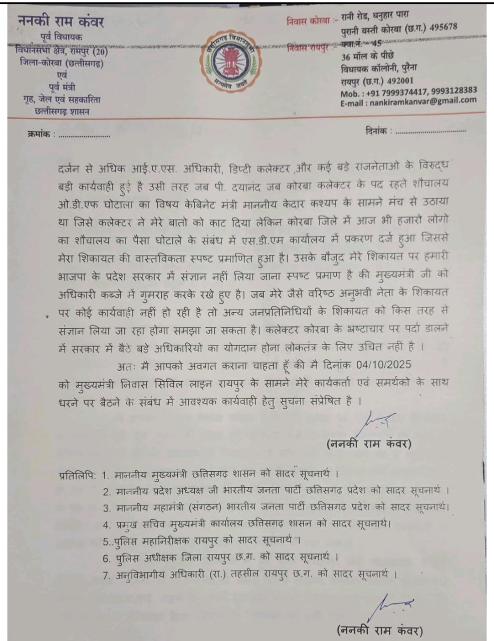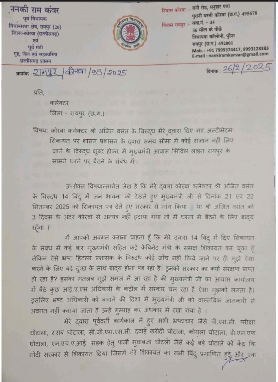 कोरबा। अल्टीमेटम के बाद भी कोरबा कलेक्टर अजीत वसंत के खिलाफ शिकायत पर कार्रवाई नहीं होने ,तबादला नहीं किए जाने ,संरक्षण से आहत पूर्व गृहमंत्री ननकीराम कंवर अपनी ही भाजपा सरकार के खिलाफ धरना देंगे।उन्होंने 4 अक्टूबर से मुख्यमंत्री कार्यालय के सामने धरना देने का ऐलान कर दिया है। जिसकी लिखित सूचना रायपुर कलेक्टर को दे दी है।
