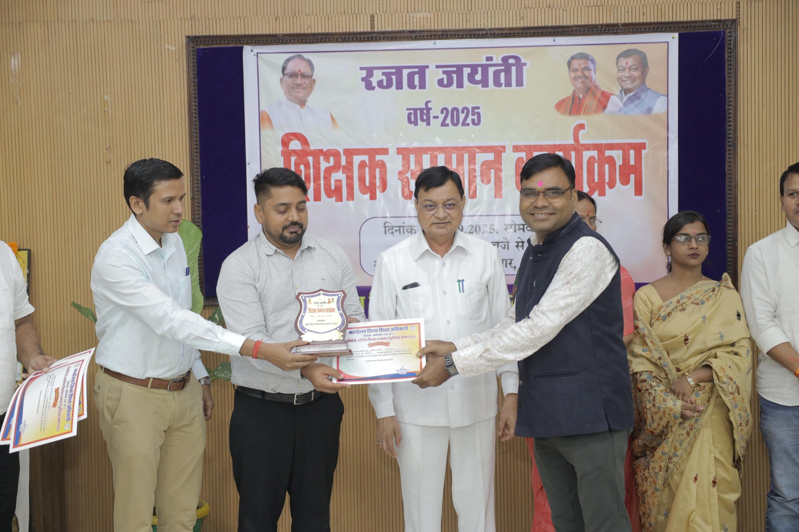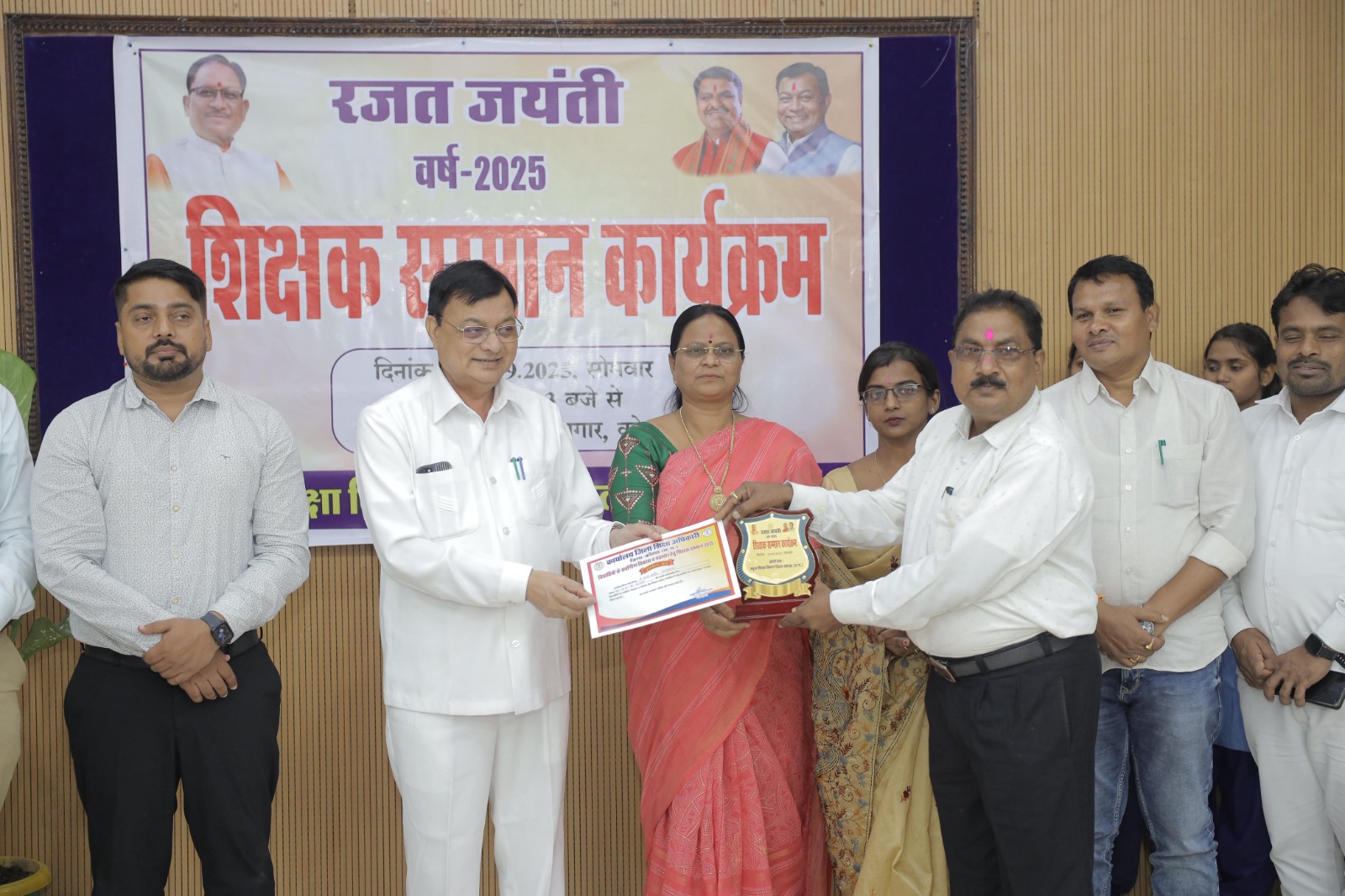 कार्यक्रम में जिले के राज्यपाल पुरस्कार से सम्मानित शिक्षक, सेवानिवृत्त शिक्षक एवं नवाचारी शिक्षकों को पुष्पमाला एवं तिलक लगाकर सम्मानित किया गया। इस अवसर पर महापौर श्रीमती संजू देवी राजपूत, जिला पंचायत अध्यक्ष डॉ पवन सिंह, नगर निगम सभापति नूतन सिंह ठाकुर , निगम आयुक्त आशुतोष पांडेय, सीईओ जिला पंचायत दिनेश नाग, डीईओ श टी पी उपाध्याय सहित अन्य जनप्रतिनिधि एवं शिक्षा विभाग के अधिकारी कर्मचारी उपस्थित थे।