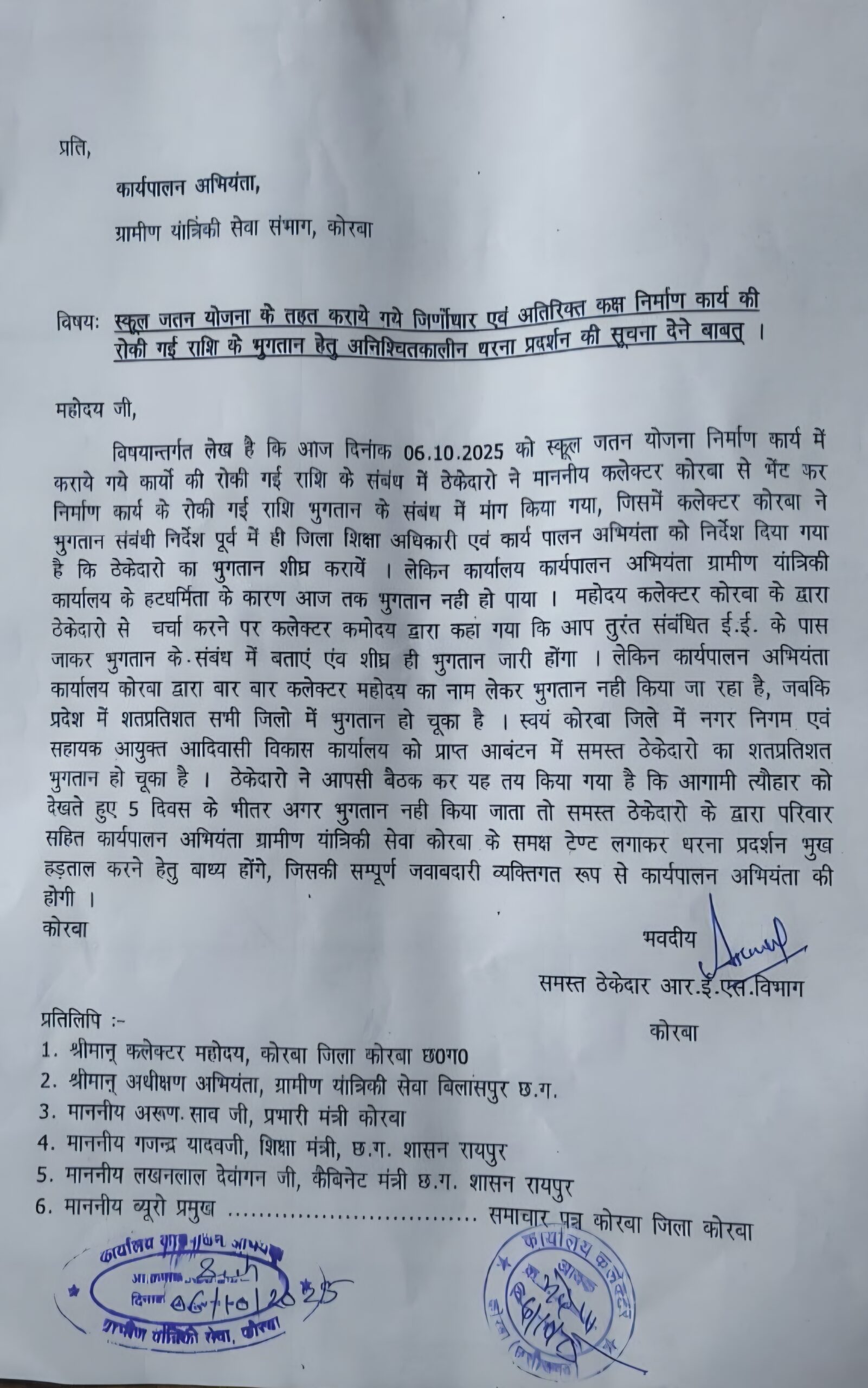 कलेक्टर के द्वारा ठेकेदारो से चर्चा करने पर कहा गया था कि आप तुरंत संबंधित ई.ई. के पास जाकर भुगतान के संबंध में बताएं एवं शीघ्र ही भुगतान जारी होगा लेकिन कार्यपालन अभियंता कार्यालय कोरबा द्वारा बार- बार कलेक्टर का नाम लेकर भुगतान नहीं किया जा रहा है, जबकि प्रदेश में शत-प्रतिशत सभी जिलो में भुगतान हो चुका है। स्वयं कोरबा जिले में नगर निगम एवं सहायक आयुक्त आदिवासी विकास कार्यालय को प्राप्त आबंटन में समस्त ठेकेदारों का शत-प्रतिशत भुगतान हो चुका है। ठेकेदारो ने आपसी बैठक कर यह तय किया है कि आगामी त्यौहार को देखते हुए 5 दिवस के भीतर अगर भुगतान नहीं किया जाता है तो समस्त ठेकेदारों के द्वारा परिवार सहित कार्यपालन अभियंता, ग्रामीण यांत्रिकी सेवा कोरबा कार्यालय के समक्ष टेण्ट लगाकर धरना प्रदर्शन, भूख हड़ताल करने हेतु बाध्य होंगे, जिसकी सम्पूर्ण जवाबदारी व्यक्तिगत रूप से कार्यपालन अभियंता की होगी।