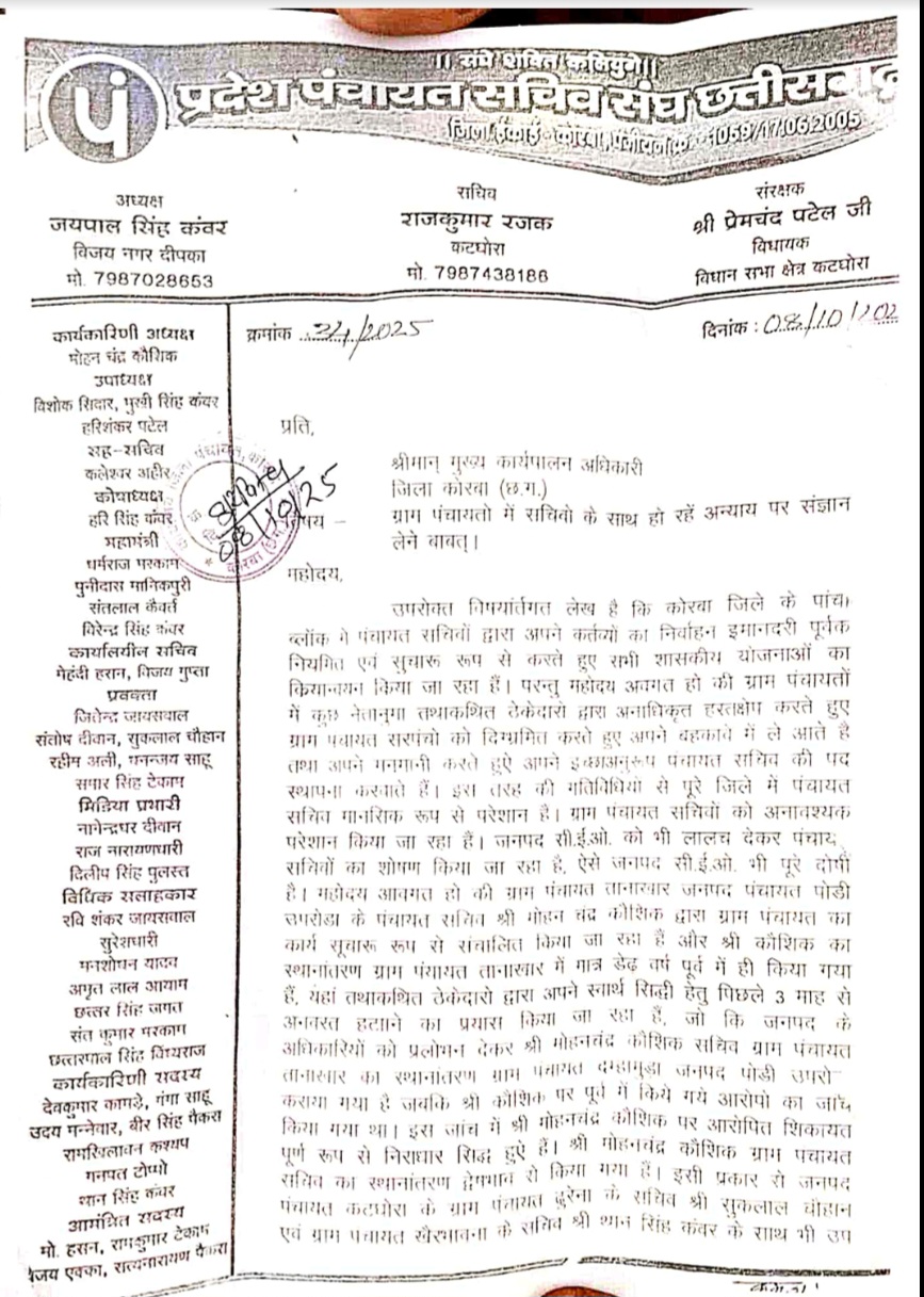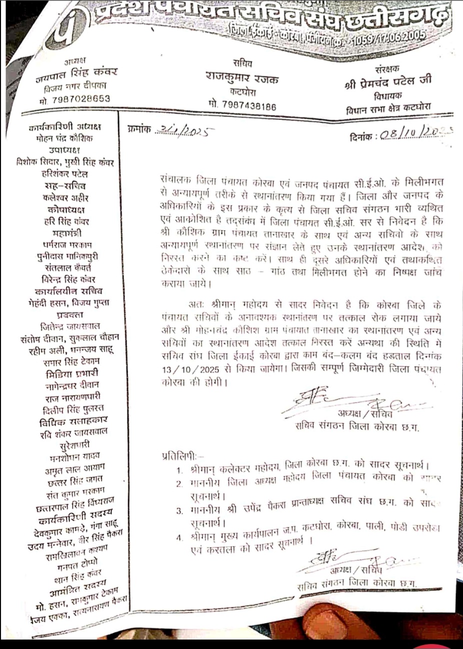 सचिव संगठन ने जिला पंचायत सीईओ को ज्ञापन सौंपकर मांग की है कि अन्यायपूर्ण तबादलों को तत्काल रद्द किया जाए। संबंधित अधिकारियों और ठेकेदारों की मिलीभगत की जांच कराई जाए। सचिवों के तबादलों की प्रक्रिया पारदर्शी बनाई जाए। संघ ने साफ कहा है कि यदि मांगें नहीं मानी गईं, तो 13 अक्टूबर 2025 से जिलेभर में काम बंद और कलम बंद हड़ताल शुरू की जाएगी। इसकी पूरी जिम्मेदारी जिला पंचायत कोरबा प्रशासन की होगी।