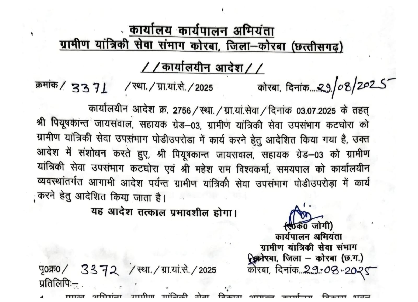 जानकारी के मुताबिक कार्यालयीन आदेश क्र. 2756/स्था./ग्रा.यां. सेवा / दिनांक 03.07.2025 के तहत् पियूषकांन्त जायसवाल, सहायक ग्रेड-03, ग्रामीण यांत्रिकी सेवा उपसंभाग कटघोरा को ग्रामीण यांत्रिकी सेवा उपसंभाग पोडीउपरोडा में कार्य करने हेतु आदेशित किया गया। उक्त आदेश में संशोधन करते हुए पियूषकान्त जायसवाल, सहायक ग्रेड-03 को ग्रामीण यांत्रिकी सेवा उपसंभाग कटघोरा एवं महेश राम विश्वकर्मा, समयपाल को कार्यालयीन व्यवस्थांतर्गत आगामी आदेश पर्यन्त ग्रामीण यांत्रिकी सेवा उपसंभाग पोडीउपरोड़ा में कार्य करने हेतु आदेशित किया गया। 29 अगस्त 2025 को कार्यपालन अभियंता ए.के. जोगी द्वारा जारी यह आदेश तत्काल प्रभावशील होना था किंतु डेढ़ माह के बाद भी महेश राम विश्वकर्मा को पोड़ी उपरोड़ा में ज्वॉइन करने नहीं दिया गया है।इस गंभीर प्रशासनिक अव्यवस्था के संदर्भ में फिलहाल कार्यपालन अभियंता ए. के.जोगी.का पक्ष नहीं आ सका है।