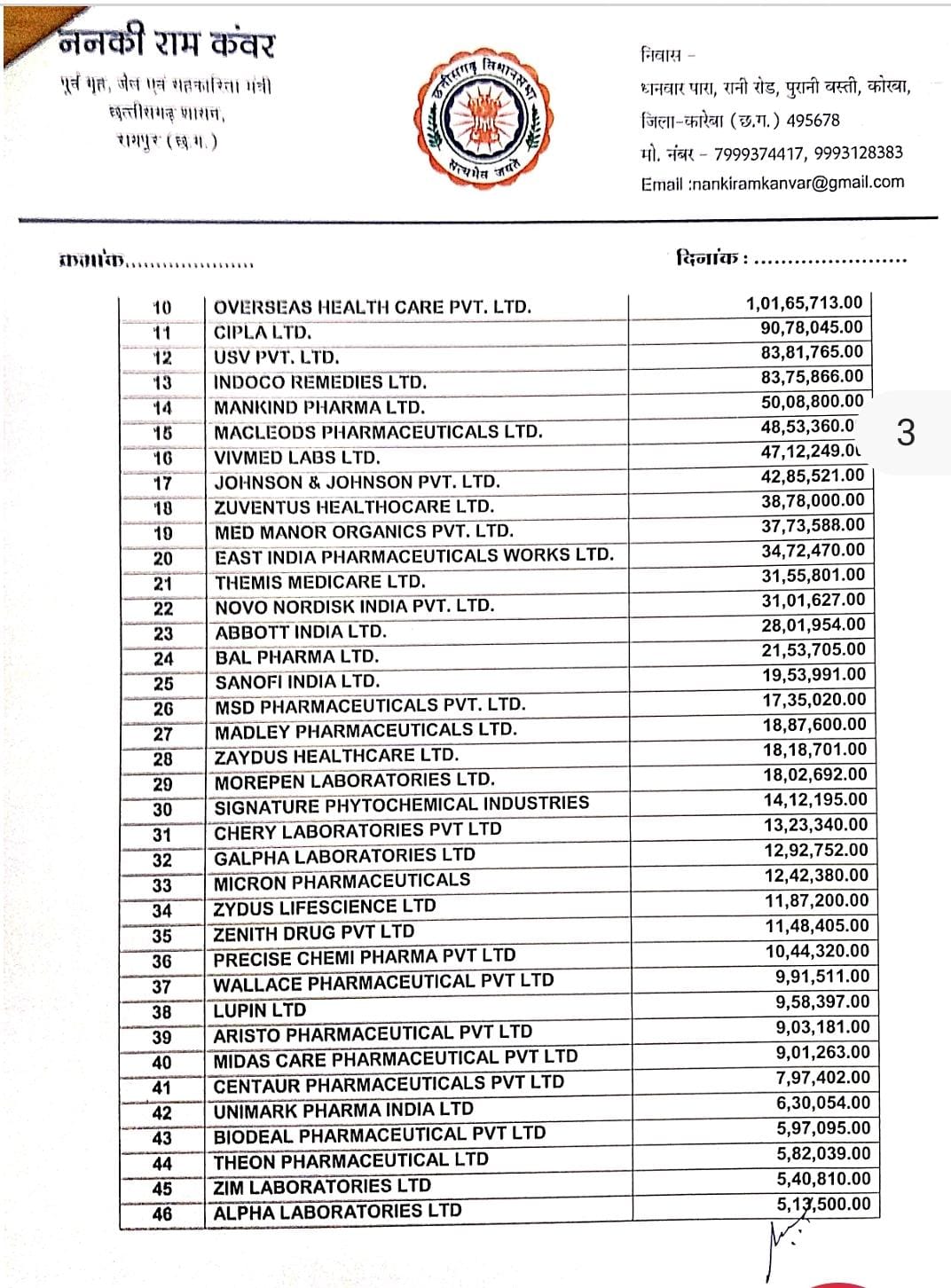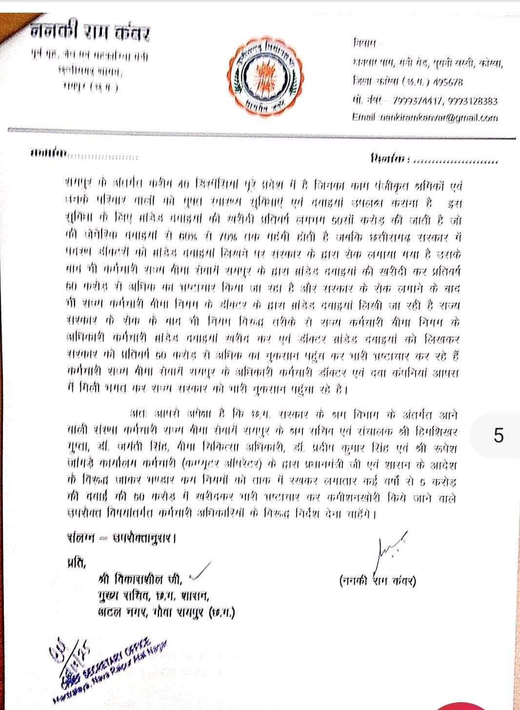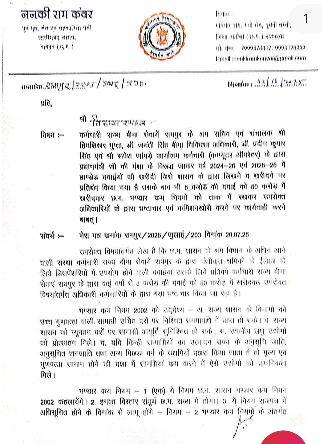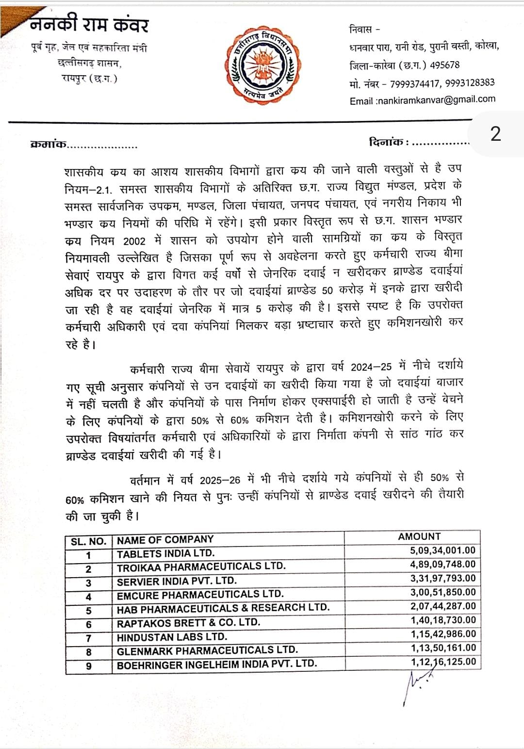 कोरबा। भाजपा के वरिष्ठ आदिवासी नेता पूर्व गृहमंत्री ननकी राम कंवर ने मुख्य सचिव छत्तीसगढ़ शासन को पत्र लिखकर चिंता जताते हुए कहा कि प्रधानमंत्री नरेंद्र मोदी की केंद्र सरकार ने जेनेरिक दवाई खरीदी पर जोर दिया है और भारत सरकार ने निर्देश भी सभी राज्यों को जारी किया गया था। लेकिन वर्तमान में विष्णु के सुशासन वाली छत्तीसगढ़ सरकार के श्रम विभाग में जेनरिक दवाईयों की जगह ब्रांडेड दवाई की नियम विरुद्ध खरीदी कर केंद्र की मोदी सरकार के निर्देश को ठेंगा दिखाया गया है।