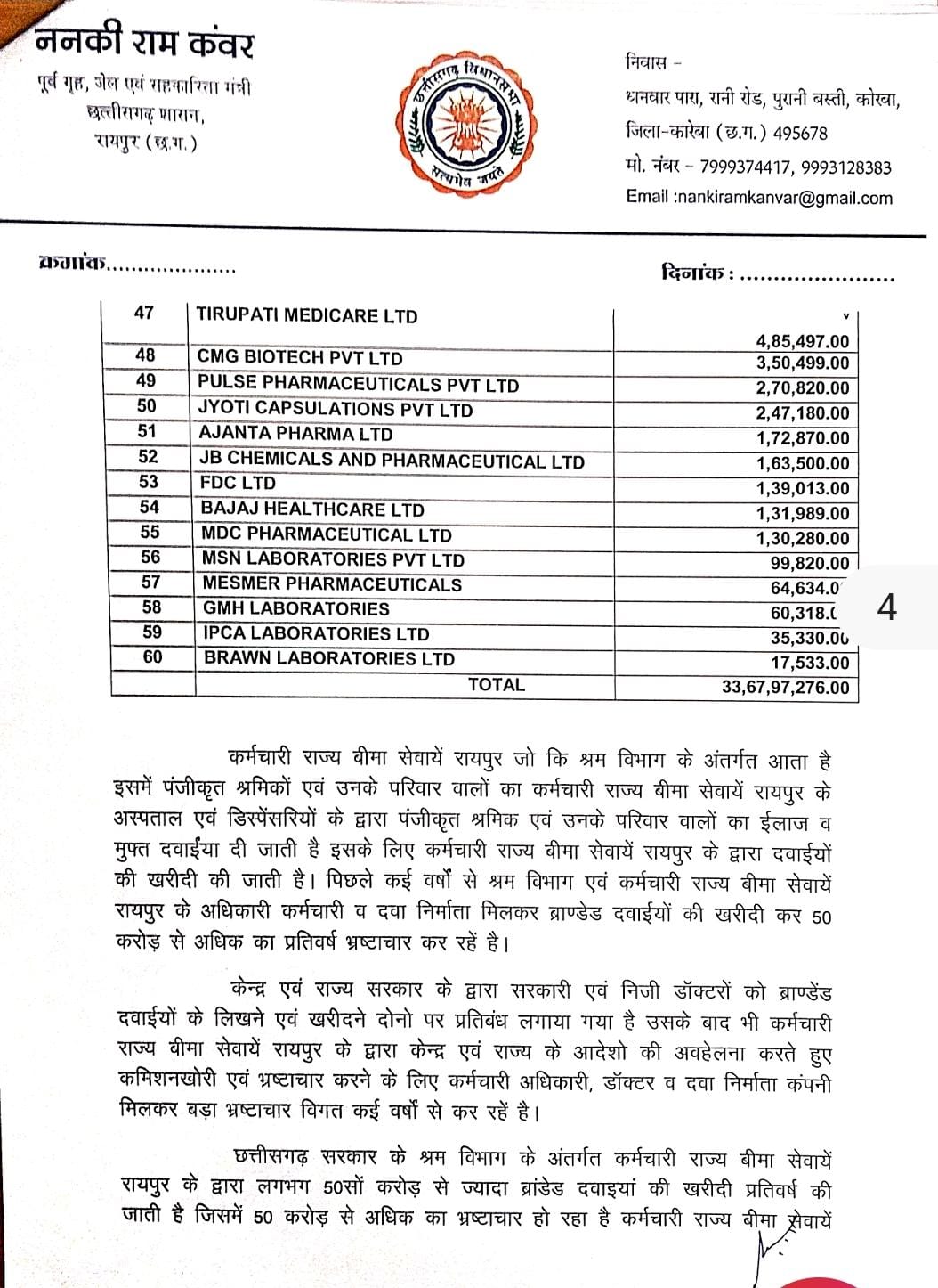 जबकि केंद्र की मोदी सरकार ने ब्रांडेड दवाई को चिकित्सकों के द्वारा नहीं लिखे जाने एवं जेनेरिक दवाई को प्राथमिकता से लिखे जाने का भी आदेश दिया था और जेनेरिक दवाई खरीदने का भी निर्देश जारी किया गया है । बावजूद इसके 5 करोड रुपए की जो दवाई खरीदी हो सकती थी उसमें श्रम विभाग के द्वारा 50 करोड रुपए में दवाई क्यों खरीदा गया ? क्या इसके पीछे बहुत बड़ा कमीशन का खेल तो नहीं है? भारी भरकम भ्रष्टाचार चल रहा है।