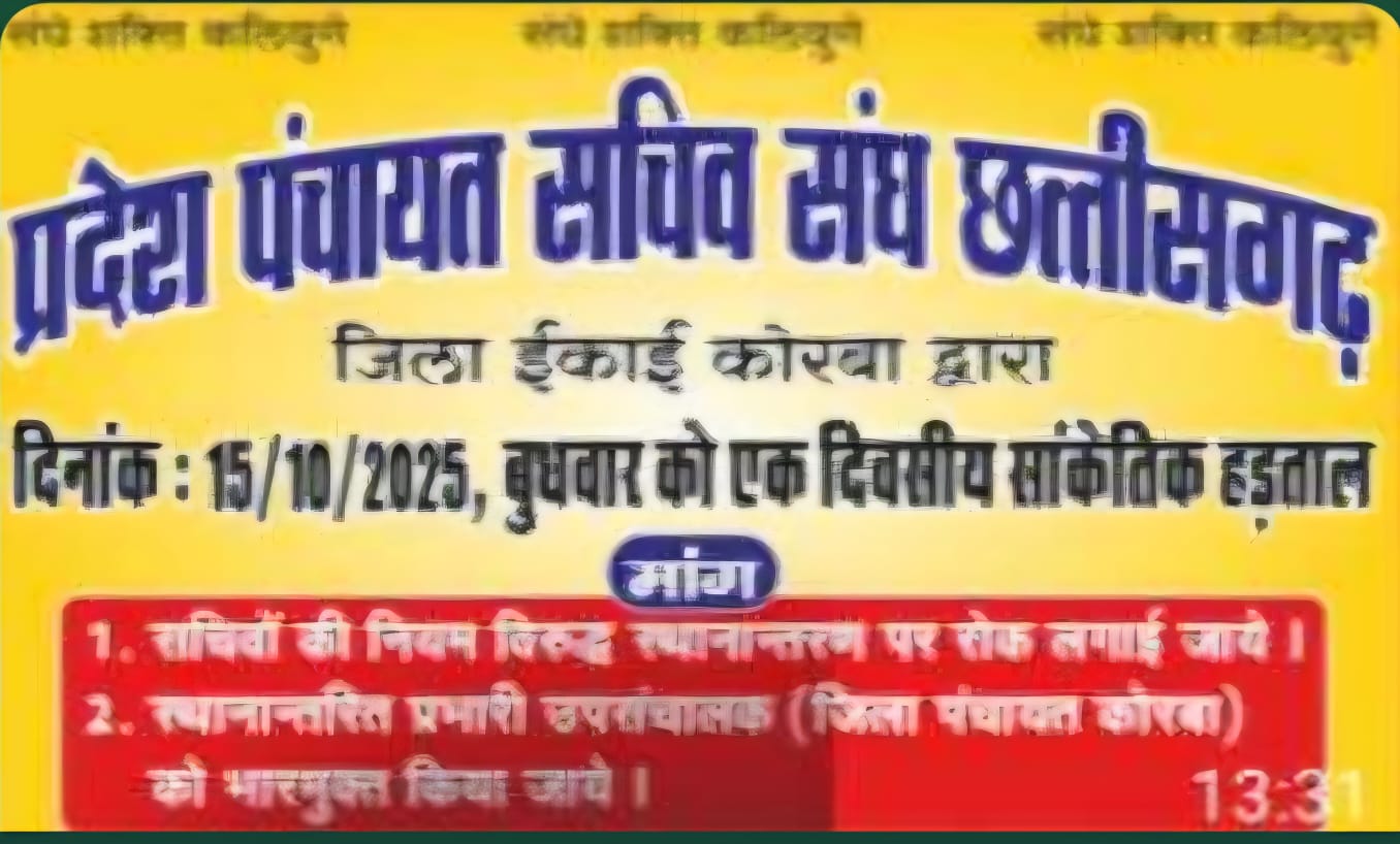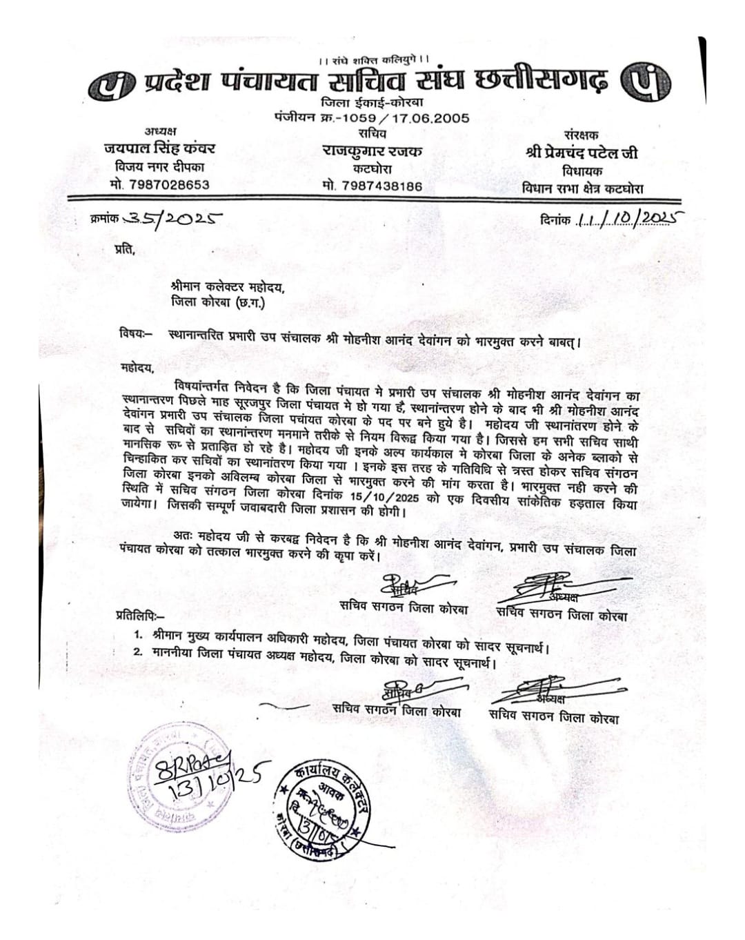 इस बार कलेक्टर को सौंपे आवेदन में इनका आरोप है कि जिला पंचायत मे प्रभारी उप संचालक मोहनीश आनंद देवांगन का स्थानान्तरण पिछले माह सूरजपुर जिला पंचायत में हो गया है, स्थानांन्तरण होने के बाद भी मोहनीश आनंद देवांगन पद पर बने हुये हैं। इनके द्वारा स्थानांतरण होने के बाद से सचिवों का स्थानांन्तरण मनमाने तरीके से नियम विरूद्ध किया गया है जिससे हम सभी सचिव साथी मानसिक रूप् से प्रताड़ित हो रहे हैं। इनके अल्प कार्यकाल में कोरबा जिला के अनेक ब्लाको से चिन्हांकित कर सचिवों का स्थानांतरण किया गया। इनके इस तरह के गतिविधि से त्रस्त होकर सचिव संगठन जिला कोरबा इनको अविलम्व कोरबा जिला से भारमुक्त करने की मांग करता है। भारमुक्त नहीं करने की स्थिति में सचिव संगठन द्वारा 15 अक्टूबर को एक दिवसीय सांकेतिक हड़ताल किया जायेगा जिसकी सम्पूर्ण जवाबदारी जिला प्रशासन की होगी।कलेक्टर से निवेदन किया गया है कि मोहनीश आनंद देवांगन, प्रभारी उप संचालक जिला पंचायत कोरबा को तत्काल भारमुक्त करने की कृपा करें।