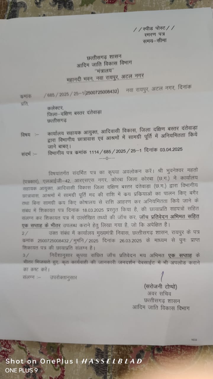 हसदेव एक्सप्रेस न्यूज दंतेवाड़ा-रायपुर । छत्तीसगढ़ के नक्सल प्रभावित दक्षिण बस्तर – दंतेवाड़ा जिले के 125 आश्रम -छात्रावासों में प्रवेशरत आदिवासी बच्चों के कपड़े ,बिस्तर ,भोजन एवं अन्य आवश्यकताओं के लिए सामाग्री पूर्ति मदान्तर्गत प्राप्त 54 लाख की शासकीय राशि कोषालय अधिकारी की मिलीभगत से बिना कलेक्टर अनुमोदन ,क्रय प्रक्रिया का पालन किए बगैर वेंडर की जगह विभागीय खाते में राशि ट्रांसफर करा शासकीय रकम डकारने के मामले में कलेक्टर कार्यालय जिम्मेदार अन्य अफसरों को प्रश्रय देने में तुला हुआ है। मुख्यमंत्री कार्यालय समेत ,आयुक्त कार्यालय के द्वारा दूसरी बार नोटिस जारी करने के बावजूद जिला प्रशासन आज पर्यन्त प्रकरण की जांच पूरी नहीं कर सकी। इधर पीएमओ को सम्बंधित अफसरों की जुगलबंदी से भ्रष्टाचार को पनाह दिए जाने की शिकायत के बाद लगाई गई फटकार से सहमे अवर सचिव आदिम जाति विकास विभाग ने कलेक्टर दंतेवाड़ा को प्रधानमंत्री कार्यालय के पत्र का हवाला देकर पुनः पत्र लिखकर जांच प्रतिवेदन अभिमत समेत एक सप्ताह के भीतर मांगने की औपचारिकता का निर्वहन किया है। पत्राचार के जरिए 6 माह से जांच दबाकर जिला प्रशासन ,जिला स्तरीय क्रय समिति समेत प्रकरण में शामिल अन्य जिम्मेदारों को संरक्षण प्रदान कर डबल इंजन की जीरो टॉलरेंस की नीति वाली भाजपा सरकार की मंशा पर पानी फेर रही है।