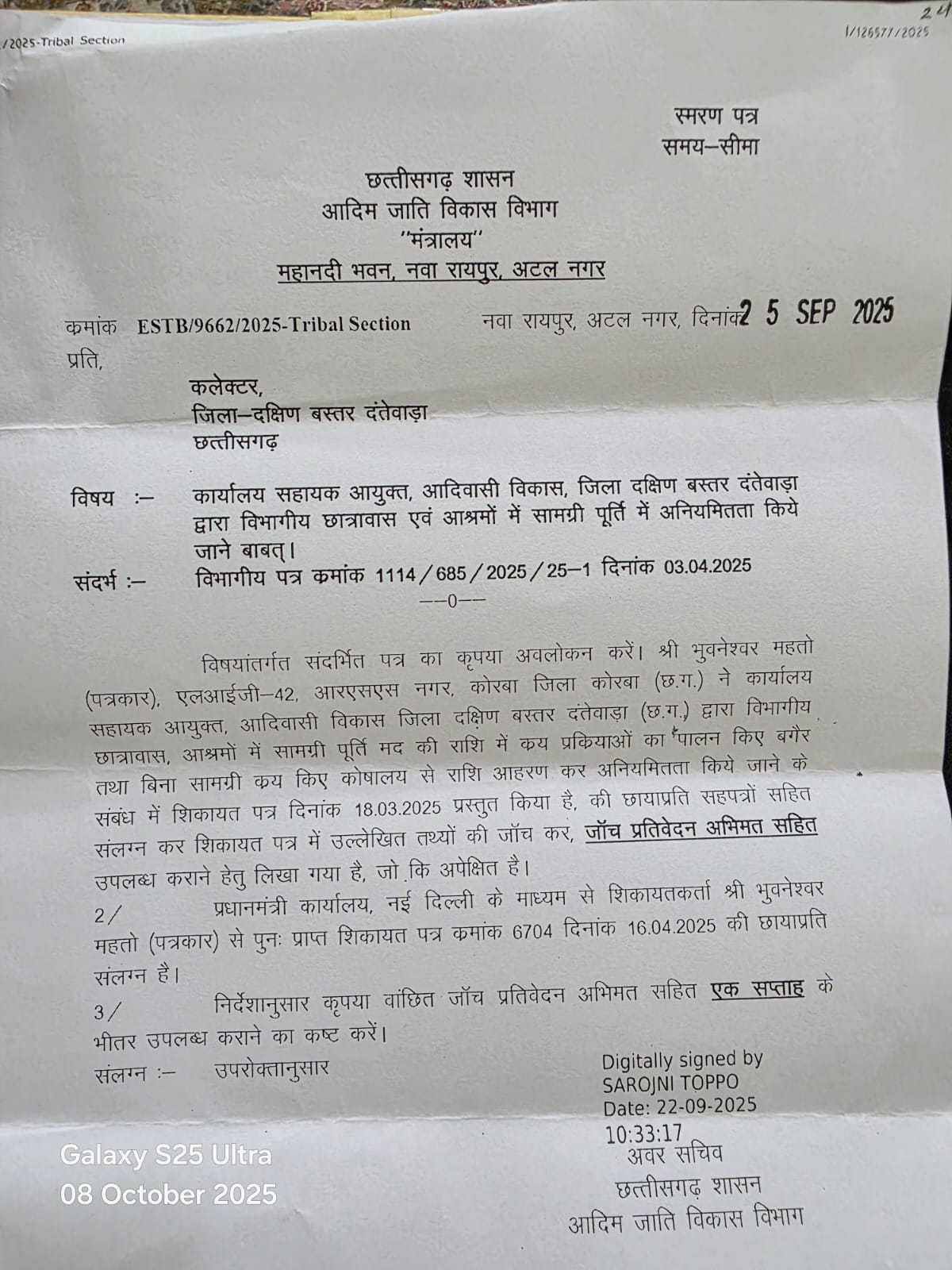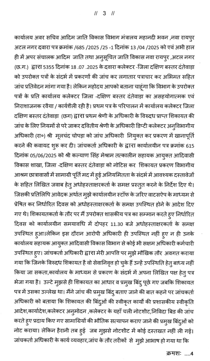 सहायक आयुक्त आदिवासी विकास जिला – दक्षिण -बस्तर -दंतेवाड़ा (छग) में पदस्थ सहायक आयुक्त कल्याण सिंह मसराम द्वारा पिछले 3 वित्तीय वर्षों से छत्तीसगढ़ शासन एवं केंद्र शासन द्वारा आश्रम छात्रावासों के विकास कार्यों के लिए प्रदत्त 11 करोड़ रुपए से भी अधिक शासकीय फंड का राज्य भंडार क्रय नियमों का पालन किए बगैर बंदरबाट किया गया है। जिसमें वित्तीय वर्ष 2024 -25 में कार्यालय आदिम जाति विकास तथा अनुसूचित जाति विकास छत्तीसगढ़ शासन ,रायपुर से क्रमांक /छा .आ./289-2/2024-25 /11662 नवा रायपुर दिनांक 17 /01 /2025 सामग्री और पूर्ति मदान्तर्गत प्राप्त 54 .45 लाख रुपए ,बीजापुर पदस्थापना के दौरान जिला खनिज संस्थान न्यास ( डीएमएफ ) से वित्तीय वर्ष 2021 -22 एवं 2022 -23 में विभिन्न 13 स्तर के कार्यों के लिए प्राप्त आबंटन 10 करोड़ 40 लाख रुपए एवं बीजापुर पदस्थापना के दौरान ही संविधान के अनुच्छेद 275 (1) मदान्तर्गत आश्रम छात्रावास निर्माण एवं खेल सामाग्री के लिए 8 करोड़ रुपए से अधिक की शासकीय धनराशि इनके कार्यकाल में व्यय की गई है। उपरोक्त तीनों मदों की राशि का जमकर बंदरबाट हुआ है।