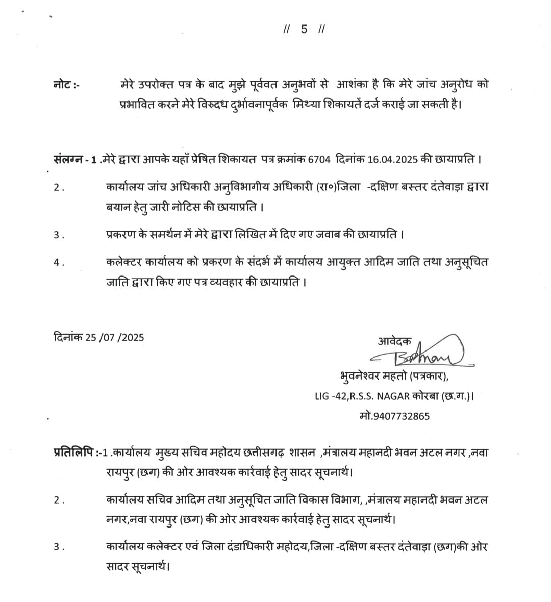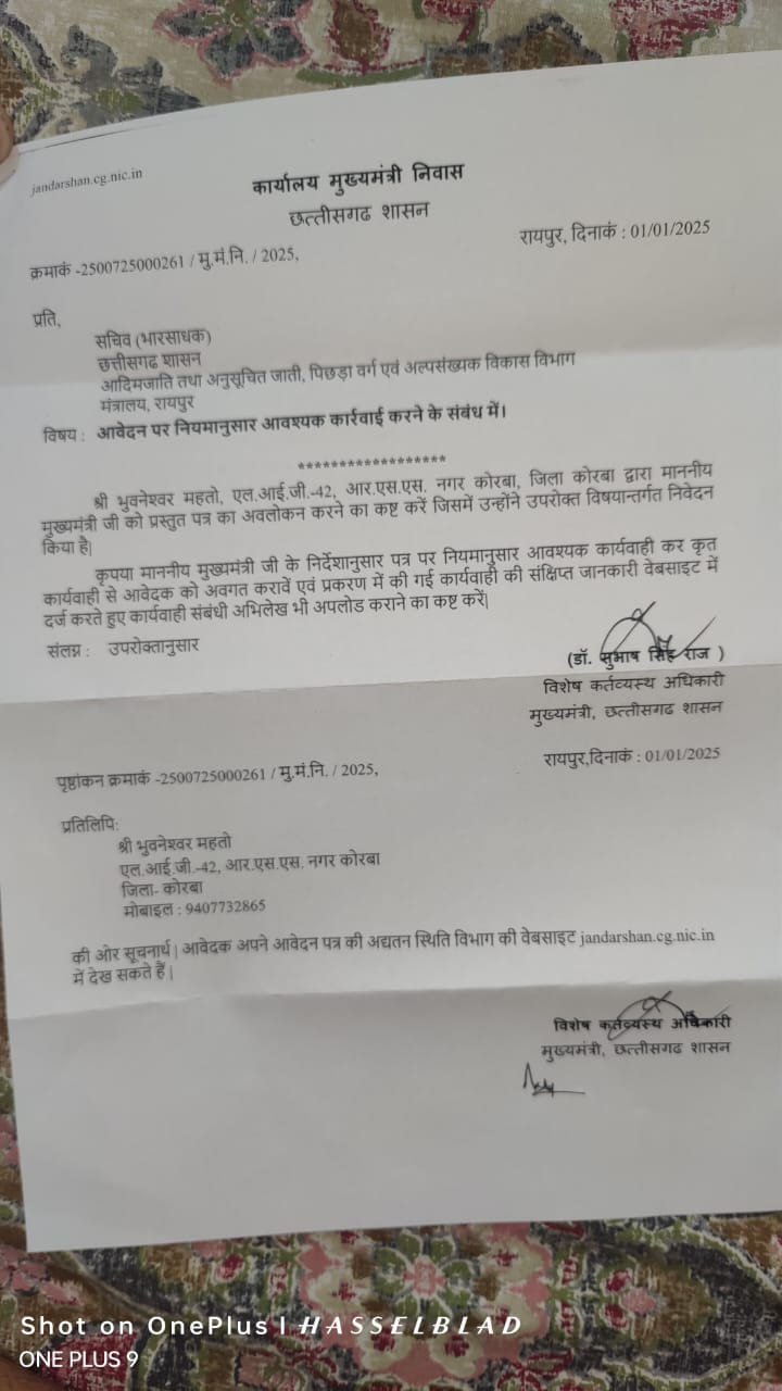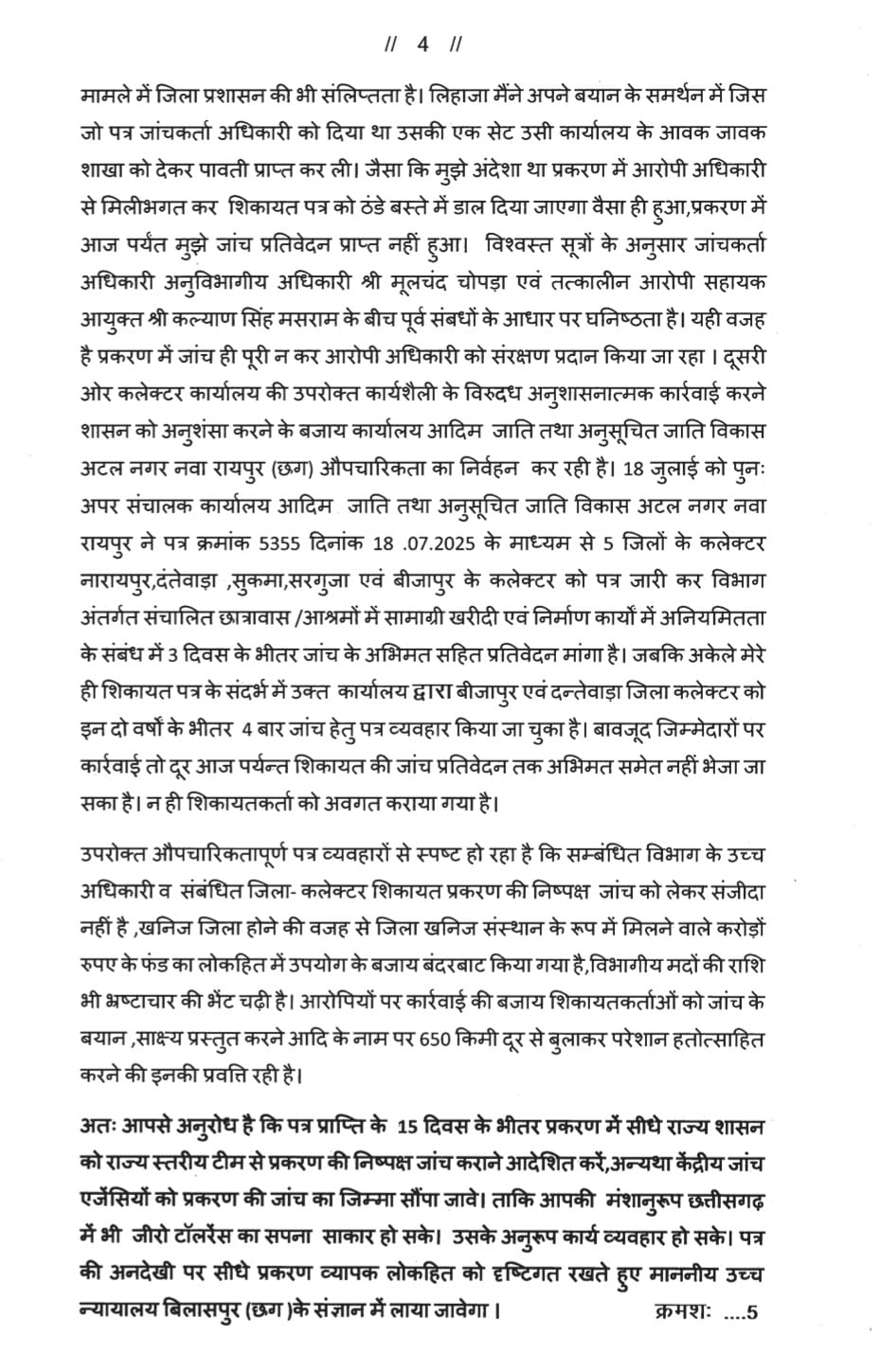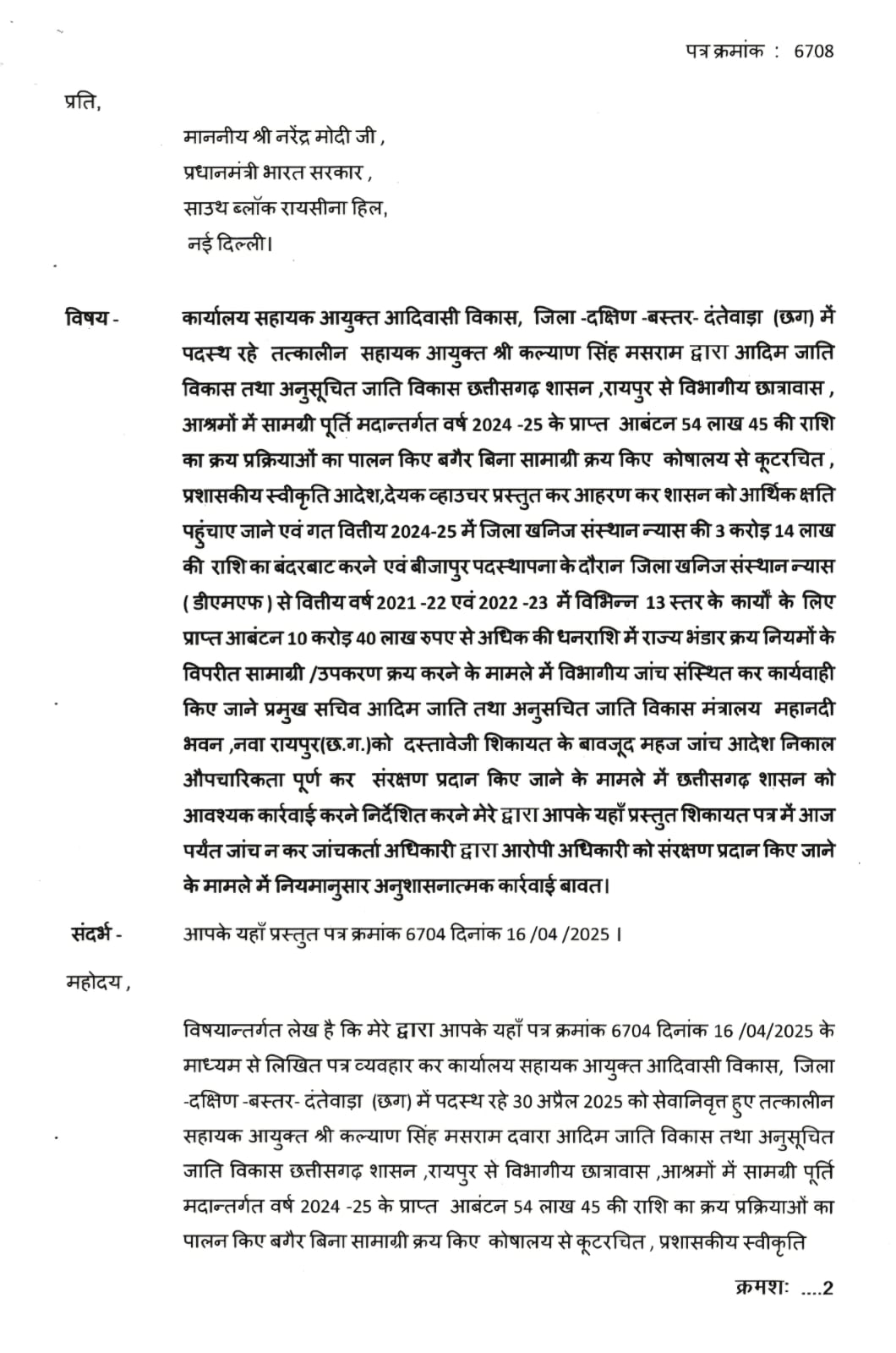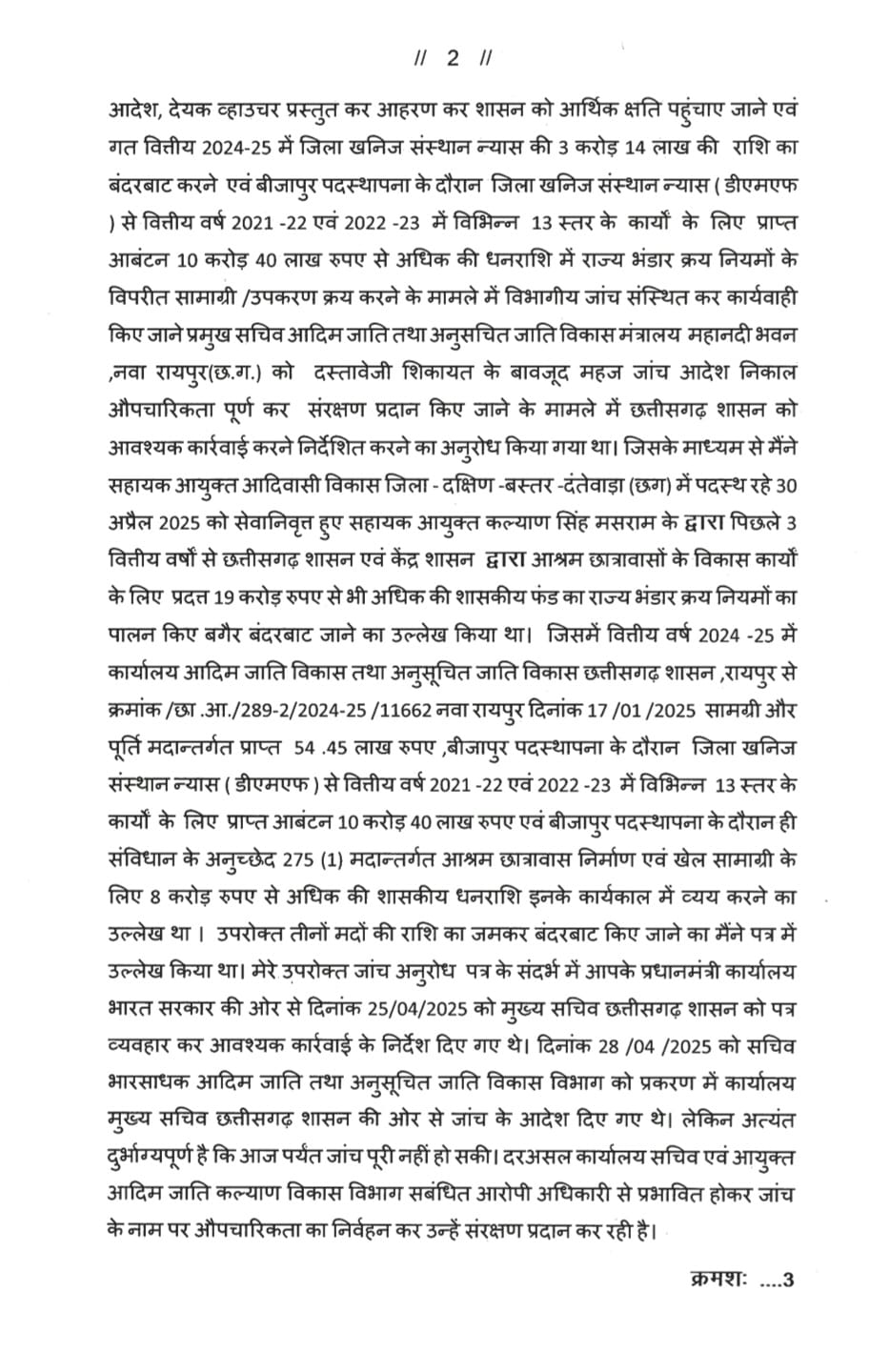 जिला खनिज संस्थान न्यास ( डीएमएफ ) से वित्तीय वर्ष 2021 -22 एवं 2022 -23 में विभिन्न 13 स्तर के कार्यों के लिए प्राप्त आबंटन 10 करोड़ 40 लाख रुपए से अधिक की धनराशि में राज्य भंडार क्रय नियमों के विपरीत सामाग्री /उपकरण क्रय करने के मामले में विभागीय जांच संस्थित कर कार्यवाही किए जाने प्रमुख सचिव आदिम जाति तथा अनुसचित जाति विकास मंत्रालय महानदी भवन ,नवा रायपुर(छ.ग.)को दस्तावेजी शिकायत के बावजूद महज जांच आदेश निकाल औपचारिकता पूर्ण कर संरक्षण प्रदान किए जाने की भी शिकायत की गई थी। माननीय प्रधानमंत्री से उक्त मामले में छत्तीसगढ़ शासन को आवश्यक कार्रवाई करने निर्देशित करने का अनुरोध किया गया था।