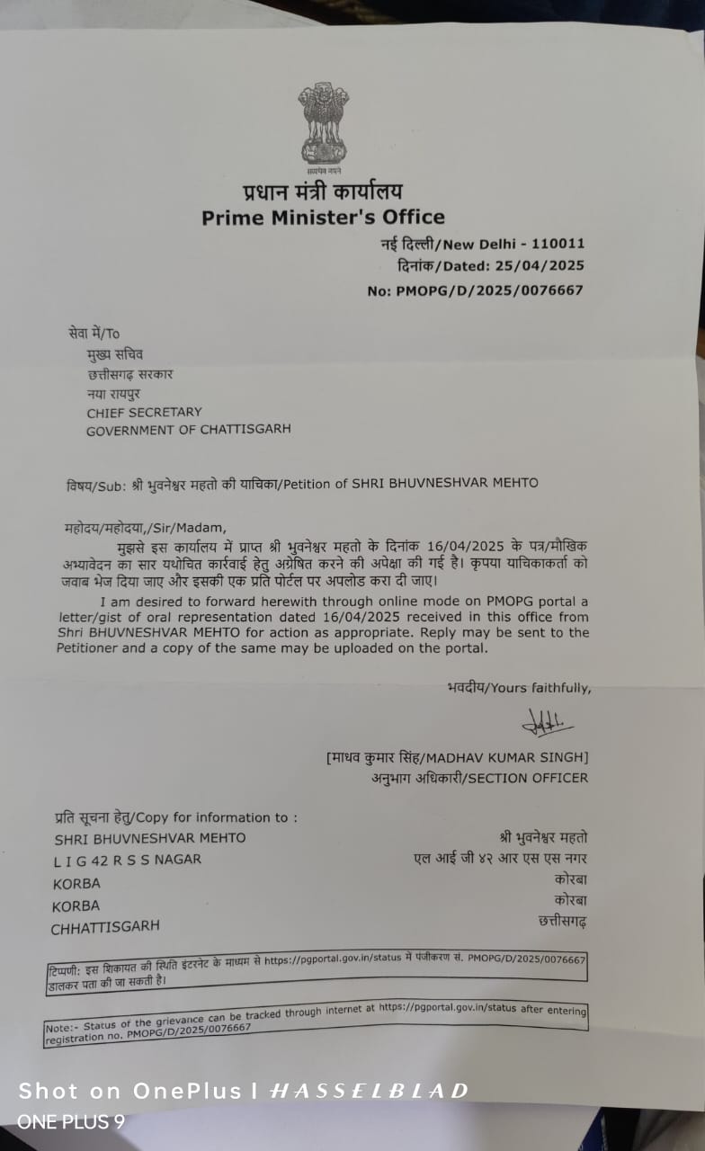 प्रकरण में तत्कालीन सहायक आयुक्त के सेवानिवृत्ति के पूर्व PMO ने जांच आदेश निकाल मुख्य सचिव को प्रकरण में विधिसम्मत कार्रवाई कर प्रतिवेदन सौंपने के आदेश दिए थे। प्रकरण सचिव आदिम जाति तथा अनुसूचित जाति विकास विभाग को आवश्यक कार्रवाई हेतु अंतरित कर दिया गया था। विभाग के अवर सचिव ने सेवानिवृत्ति के 2 दिन पूर्व 29 अप्रैल को कलेक्टर ,जिला -दक्षिण बस्तर दंतेवाड़ा को पत्र लिखकर प्रकरण की जांच प्रतिवेदन एक सप्ताह के भीतर मांगा था। जनदर्शन वेबसाइट में अपलोड करने का निर्देश दिया था। लेकिन कार्यालय कलेक्टर ने यहीं से संबंधित प्रकरण में लीपापोती शुरू कर दी । प्रकरण में जांच अधिकारी अपर कलेक्टर रैंक के अफसर को बनाने की जगह एसडीएम दंतेवाड़ा श्री मूलचंद चोपड़ा को बनाकर जांच का जिम्मा सौंप दिया गया।जांच अधिकारी एसडीएम दंतेवाड़ा मूलचंद चोपड़ा के यहाँ प्रकरण में 5 जून 2025 को लिखित साक्ष्य सहित बयान दर्ज कराए जाने के बावजूद जिम्मेदारों के विरिद्ध कार्रवाई न होता देख ,उनसे लगाव की विश्वस्त सूत्रों से मिल रही जानकारी को मद्देनजर PMO को प्रकरण में 25 जुलाई 2025 को पत्र क्रमांक 6708 के माध्यम से ध्यानाकर्षण पत्र लिखा गया। जिसके बाद अब जाकर PMO ने कार्यालय मुख्य सचिव पर नाराजगी जाहिर कर विधि सम्मत कार्रवाई के निर्देश दिए हैं। जिससे हड़बड़ाए आयुक्त कार्यालय ने 25 सितम्बर को कलेक्टर को पुनः स्मरण पत्र जारी कर कागजी खानापूर्ति की है। जबकि कलेक्टर ने इस बार भी कोई रुचि नहीं दिखाई जो गम्भीर अनुशासनहीनता ,प्रशासनिक लापरवाही का प्रमाण है। प्रकरण जल्द केंद्रीय जांच एजेंसियों को दिए जाने के आसार हैं ,ताकि सभी जिम्मेदारों पर विधिसम्मत कार्रवाई सुनिश्चित की जा सके।