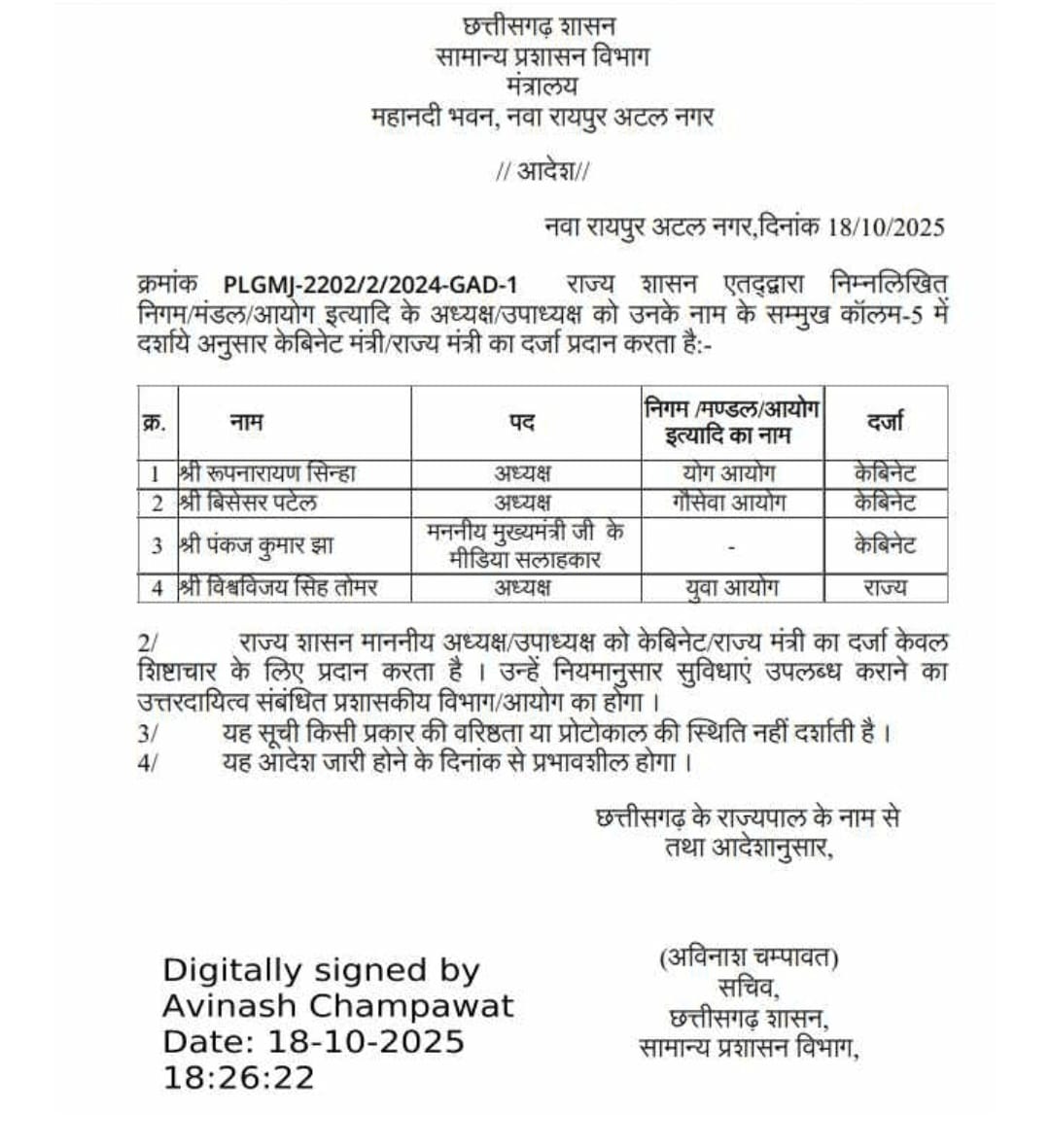 वहीं, युवा आयोग के अध्यक्ष विश्वविजय सिंह तोमर को राज्य मंत्री का दर्जा देने का आदेश जारी किया गया है। इस संबंध में सामान्य प्रशासन विभाग ने आज आधिकारिक आदेश जारी किया है।