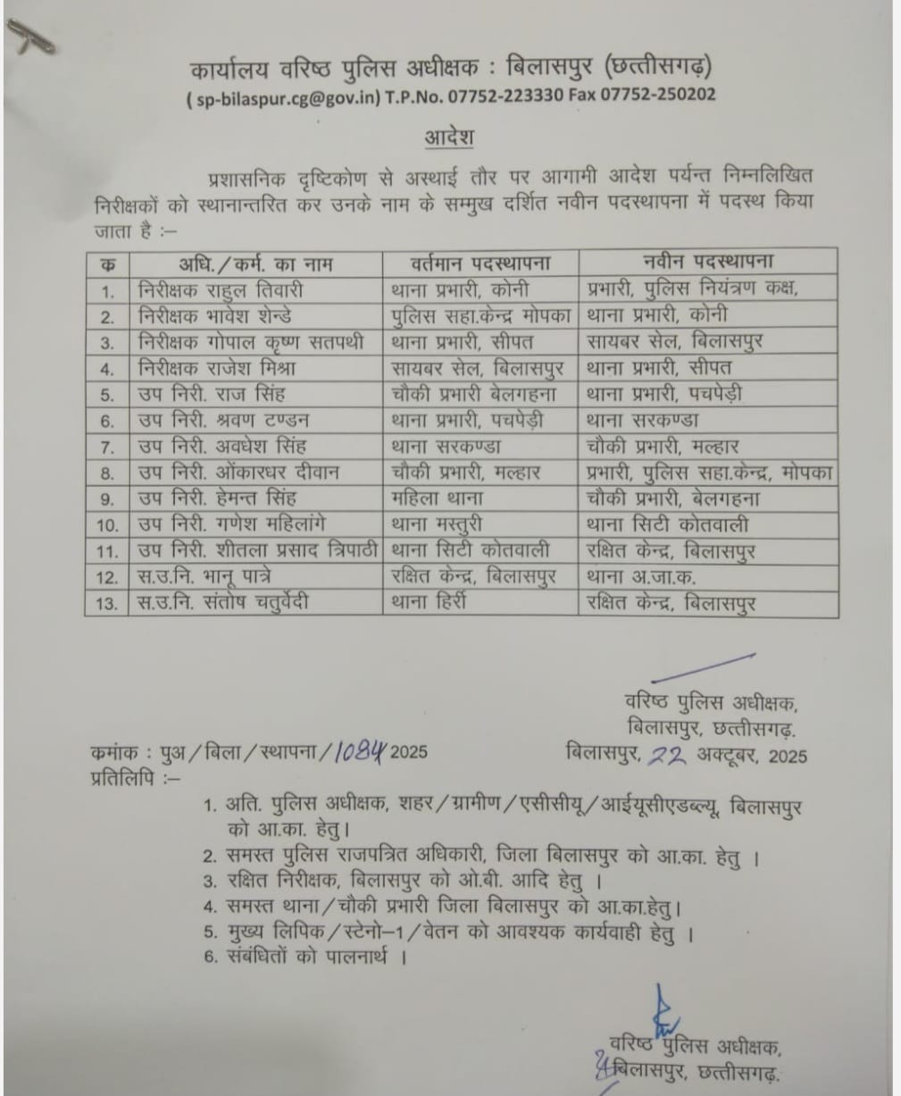 बिलासपुर। सीपत थाना क्षेत्र में हाल ही में हुए विवाद के बाद पुलिस विभाग ने सख्त रुख अपनाते हुए चार थाना प्रभारियों सहित कुल 13 पुलिस अधिकारियों-कर्मचारियों का तबादला कर दिया है। बिलासपुर के वरिष्ठ पुलिस अधीक्षक (एसएसपी) ने मंगलवार देर रात यह आदेश जारी किया। इस कदम को विभागीय अनुशासन और प्रशासनिक नियंत्रण को मजबूत करने के रूप में देखा जा रहा है।
