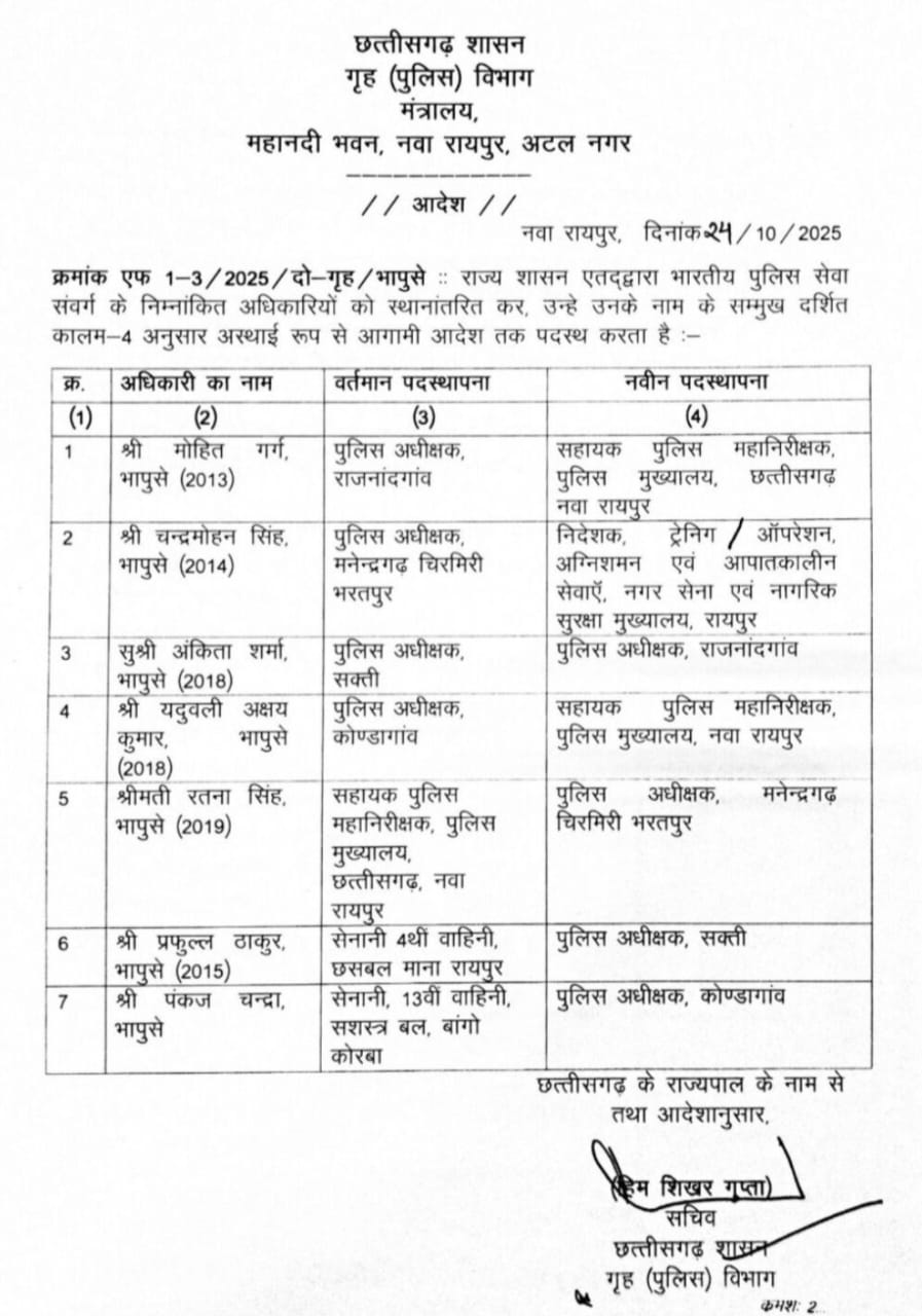 रायपुर। राज्य सरकार ने IPS अधिकारियों का नवीन पदस्थापना आदेश जारी किया है। जारी आदेश के तहत 7 IPS का तबादला किया गया है। इनमें 4 जिलों राजनांदगांव ,मनेंद्रगढ़-चिरमिरी -भरतपुर, सक्ती एवं कोंडागाँव के एसपी प्रभावित हुए हैं। विश्वस्त सूत्रों की मानें तो राज्य स्थापना दिवस से पूर्व जल्द ही IAS अधिकारियों का स्थानांतरण आदेश जारी होगा। जिसमें आधा दर्जन जिलों के कलेक्टर बदले जा सकते हैं। जिसका आधार शासन की योजनाओं का जिलों में जमीनी स्तर पर क्रियान्वयन में ढिलाई ,एवं जनशिकायत बन सकता है। प्रधानमंत्री के आगमन के पूर्व ऐसे कलेक्टरों की उन जिलों से छुट्टी तय मानी जा रही है।