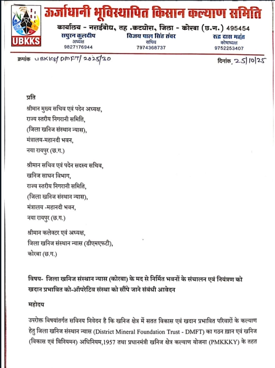 कोरबा। ऊर्जाधानी भूविस्थापित किसान कल्याण समिति ने जिला खनिज संस्थान न्यास (DMFT) की कार्यप्रणाली पर गंभीर सवाल उठाते हुए आरोप लगाया है कि न्यास अपने मूल उद्देश्य से भटक गया है और प्रत्यक्ष रूप से खदानों से प्रभावित एवं विस्थापित परिवारों की उपेक्षा कर रहा है समिति ने इस संबंध में राज्य स्तरीय निगरानी समिति के अध्यक्ष (मुख्य सचिव) और कोरबा कलेक्टर को एक विस्तृत आवेदन सौंपा है ।