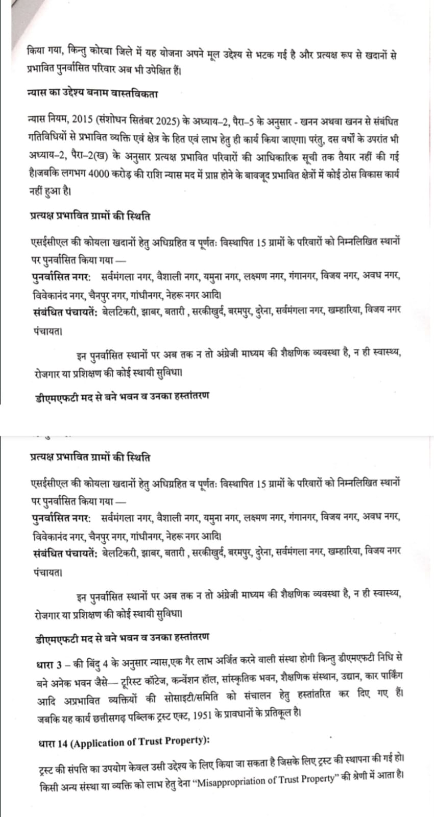आवेदन में कहा गया है कि DMFT मद से बने टूरिस्ट कॉटेज, कन्वेंशन हॉल, सांस्कृतिक भवन, शैक्षणिक संस्थान आदि गैर-प्रभावित व्यक्तियों की सोसाइटी/समिति को संचालन हेतु हस्तांतरित कर दिए गए हैं, जो छत्तीसगढ़ पब्लिक ट्रस्ट एक्ट, 1951 की धारा 14 (Misappropriation of Trust Property) का स्पष्ट उल्लंघन है लाभार्थियों की उपेक्षा यह गंभीर है कि ट्रस्ट की संपत्ति का उपयोग केवल उसी उद्देश्य के लिए किया जाना चाहिए जिसके लिए ट्रस्ट की स्थापना की गई थी (यानी खनन प्रभावितों के लाभ के लिए) ।