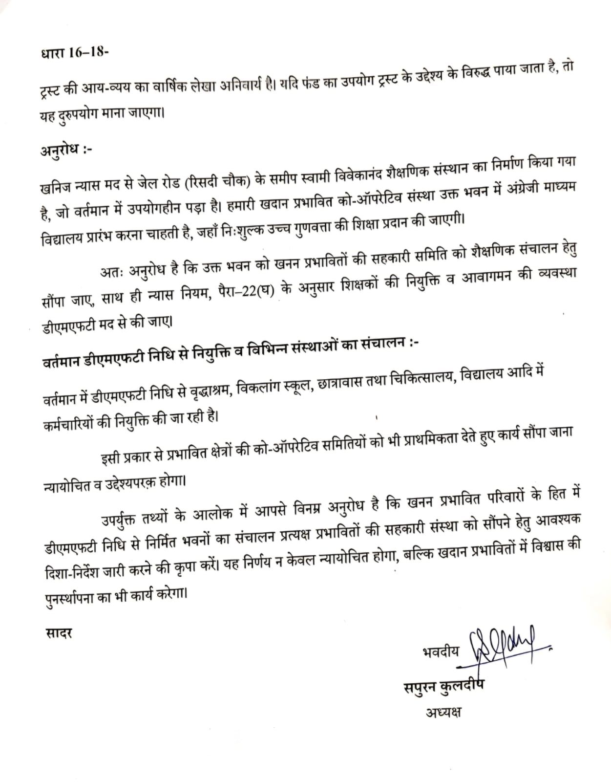 सपुरन कुलदीप ने अंत में प्रशासन से विनम्र अनुरोध किया है कि खनन प्रभावित परिवारों के हित में DMFT निधि से निर्मित भवनों का संचालन प्रत्यक्ष प्रभावितों की सहकारी संस्था को सौंपने हेतु आवश्यक दिशा-निर्देश जारी किए जाएं, ताकि न्याय की पुनर्स्थापना हो सके और यह योजना अपने वास्तविक उद्देश्य को प्राप्त कर सके।