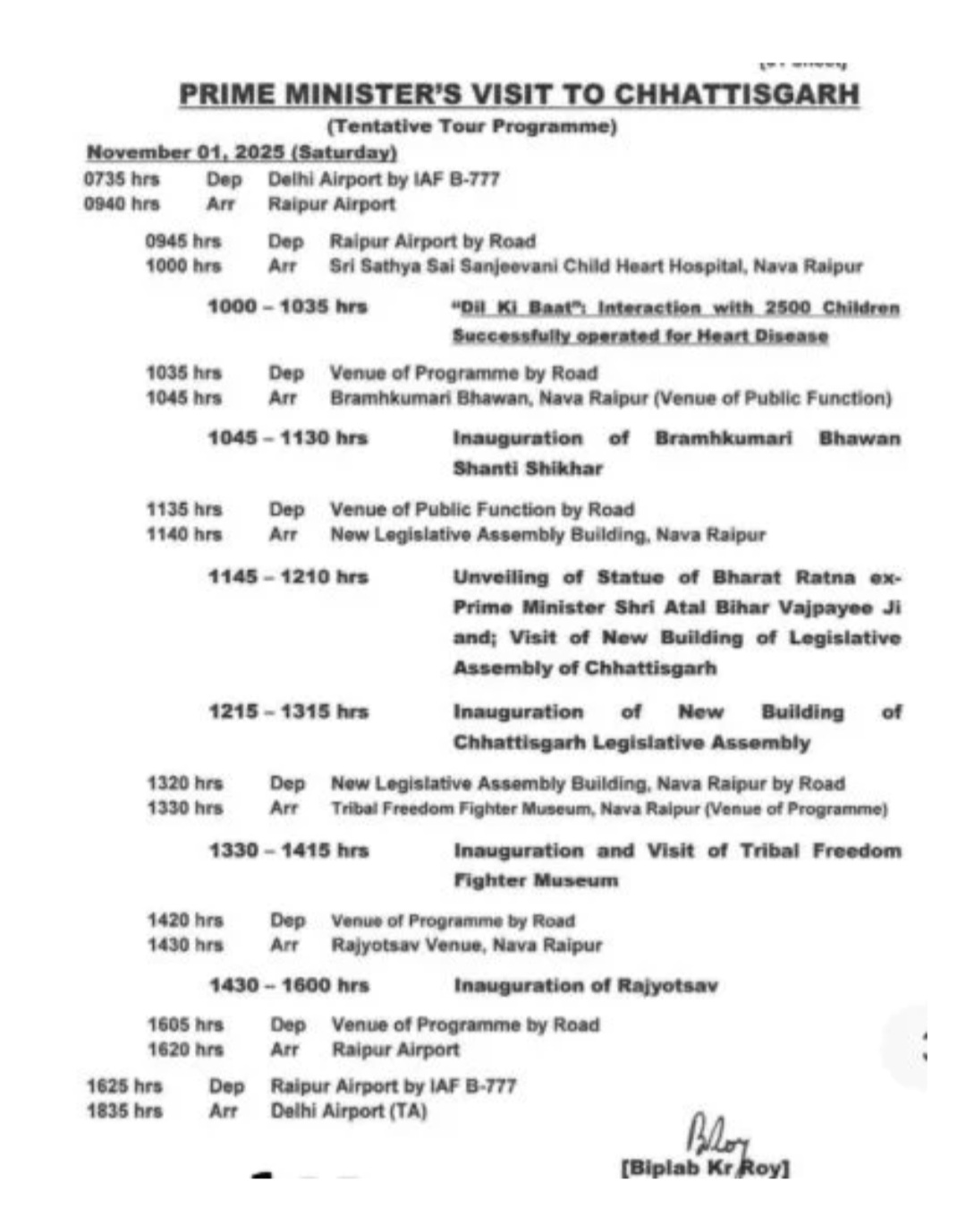 रायपुर। छत्तीसगढ़ के राज्य स्थापना दिवस के अवसर पर 1 नवंबर को आयोजित होने वाले राज्योत्सव में शामिल होने के लिए प्रधानमंत्री नरेंद्र मोदी एक दिवसीय प्रवास पर रायपुर आएंगे। प्रधानमंत्री कार्यालय (PMO) द्वारा जारी आधिकारिक कार्यक्रम के अनुसार, पीएम मोदी 1 नवंबर, 2025 को सुबह 7:35 बजे भारतीय वायु सेना के IAF B-777 विमान से दिल्ली हवाई अड्डे से रवाना होंगे और सुबह 9:40 बजे रायपुर के माना हवाई अड्डे पर पहुंचेंगे।