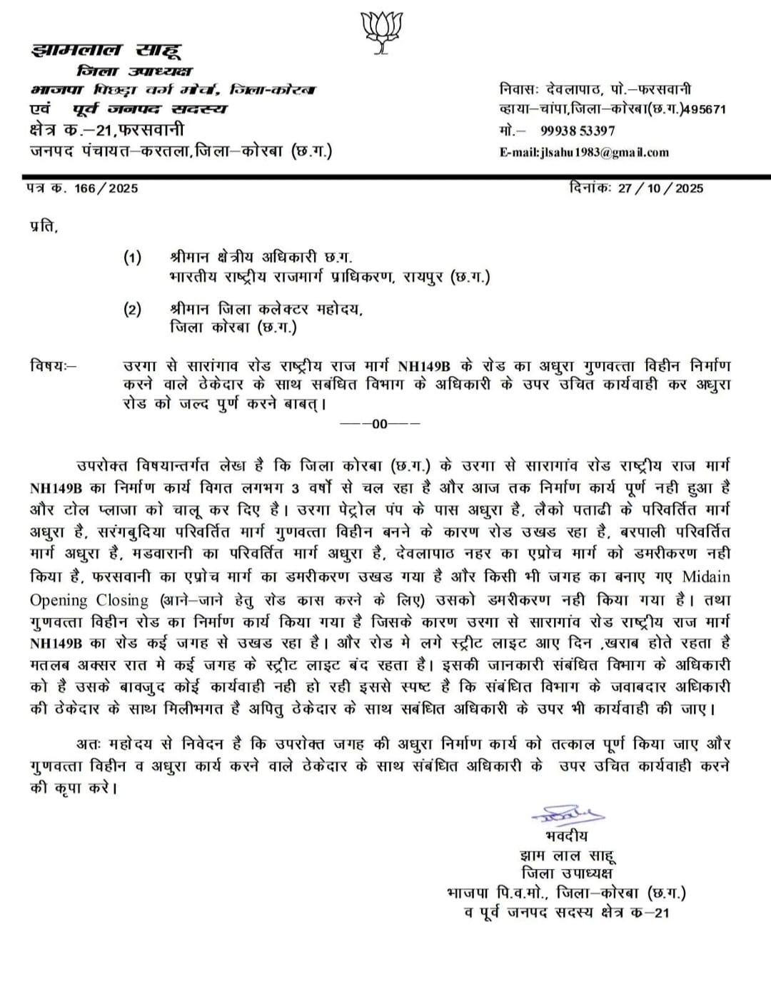 कोरबा। उरगा से सारागांव तक राष्ट्रीय राजमार्ग NH-149B के अधूरे निर्माण ,जर्जर सर्विस रोड के बावजूद वसूली जा रही टोल को लेकर अब सत्तारूढ़ पार्टी से भी सवाल उठने लगे हैं। भारतीय राष्ट्रीय राजमार्ग प्राधिकरण (NHAI) और संबंधित विभाग के अधिकारियों पर लापरवाही का आरोप लगाते हुए भाजपा नेता श्री झामलाल साहू, जिला उपाध्यक्ष भाजपा पि.व.मो. एवं पूर्व जनपद सदस्य क्षेत्र क-21 ने क्षेत्रीय अधिकारी, एनएचएआई रायपुर तथा जिला कलेक्टर कोरबा को ज्ञापन सौंपकर अधूरे और घटिया निर्माण कार्य की जांच व कार्यवाही की मांग कर खलबली मचा दी है।