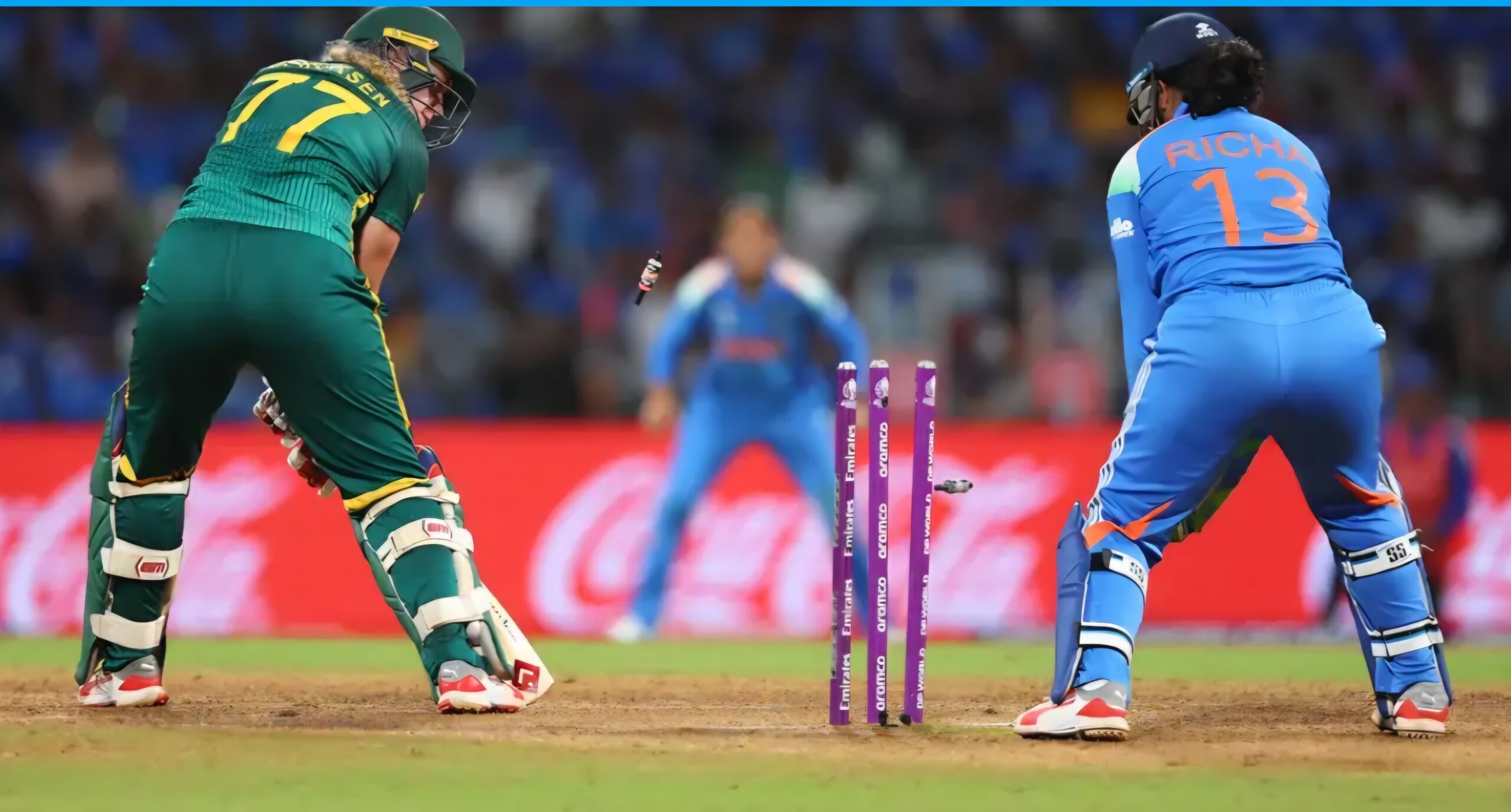 जेमिमा रोड्रिग्स (24) और कप्तान हरमनप्रीत कौर (20) रन बनाकर जल्दी आउट हो गईं। ऑलराउंडर दीप्ति शर्मा ने एक टूर्नामेंट का तीसरा अर्धशतक पूरा किया। वह 58 रन बनाकर रन आउट हुईं। ऋचा घोष ने अपने अंदाज में बल्लेबाजी की। ऋचा ने 24 गेंद पर 3 चौके और 2 छक्कों की मदद से 34 रन की तेज पारी खेली। खाका के नाम तीन विकेट रही।299 रनों के लक्ष्य का पीछा करने उतरी भारतीय महिला टीम कप्तान लौरा वोल्वार्ड्ट की 101 रनों की शतकीय पारी के बावजूद नियमित अंतराल में विकेट गिरने की वजह से 246 रनों पर सिमट गई। जहां दीप्ति शर्मा ने 5 विकेट झटके तो वहीं शेफाली वर्मा ने भी 2 विकेट चटकाए। चरणी ,रेणुका ठाकुर ने भी शानदार गेंदबाजी की।