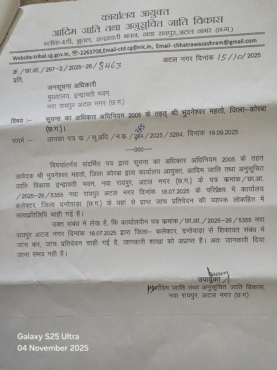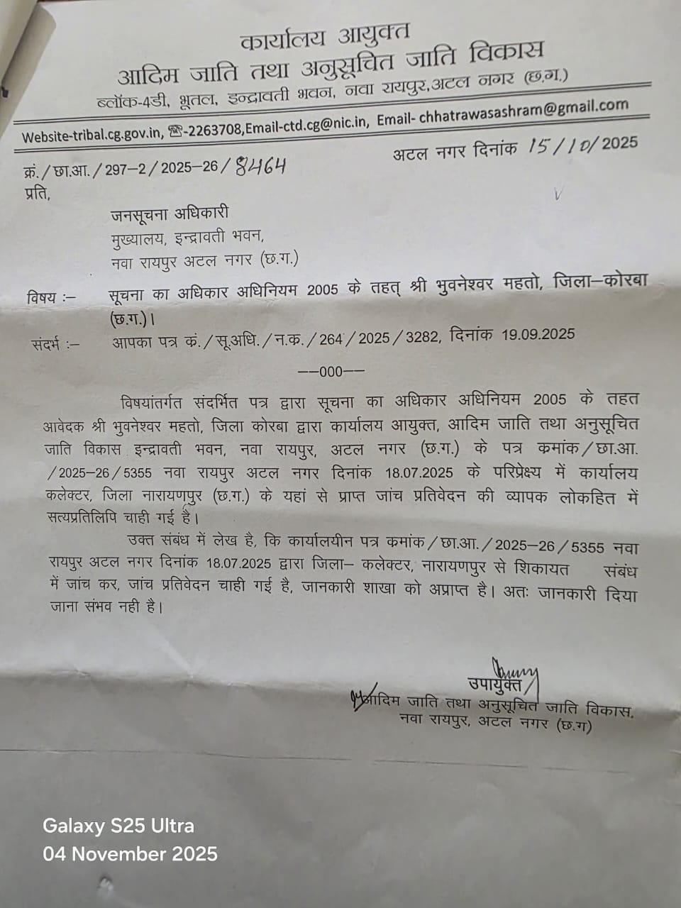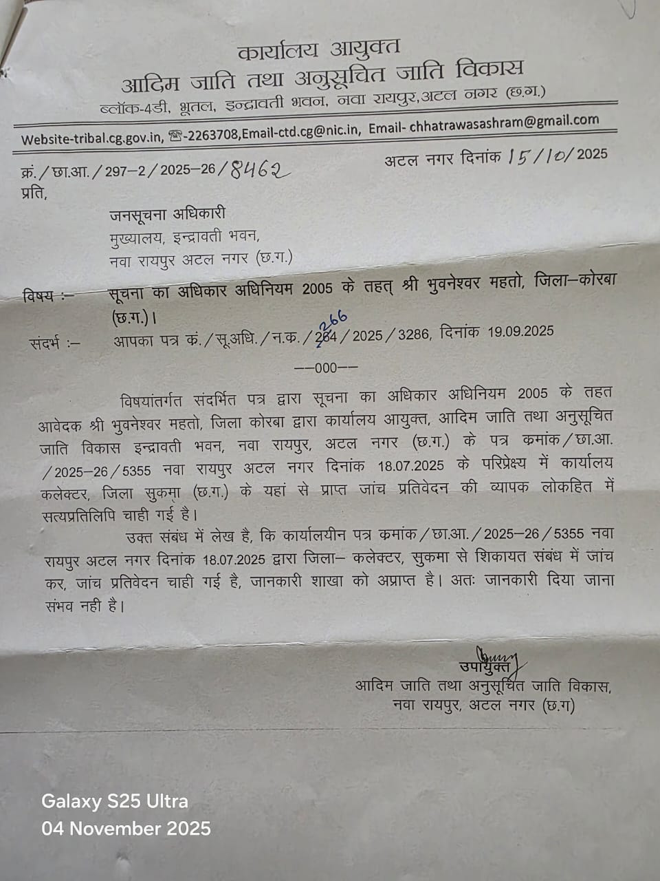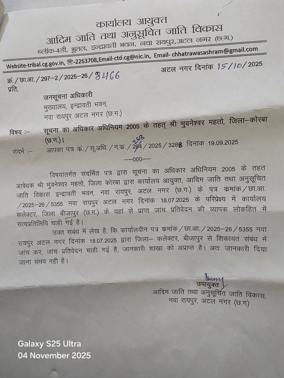 गौरतलब हो कि अपर संचालक आदिम जाति तथा अनुसूचित जाति विकास नवा रायपुर अटल नगर द्वारा कलेक्टरों को जारी पत्र में छ.ग. शासन आदिम जाति तथा अनुसूचित जाति विकास विभाग मंत्रालय महानदी भवन ,नवा रायपुर अटल नगर का पत्र क्र.एफ 3 -16 /2025/25-1नवा रायपुर अटल नगर का दिनांक 18.07.2025 को जारी पत्र का संदर्भ दिया गया है। जिसमें कार्याकय सहायक आयुक्त आदिवासी विकास विभाग द्वारा प्रदेश के 5 जिलों नारायणपुर ,दंतेवाड़ा ,बीजापुर ,सुकमा एवं सरगुजा में जिले के छात्रावास /आश्रमों में सामाग्री क्रय ,मरम्मत एवं निर्माण कार्य में अनियमितता संबंधी मीडिया में प्रकाशित शिकायत के संदर्भ में शासन द्वारा जांच प्रतिवेदन चाहे जाने का उल्लेख था।