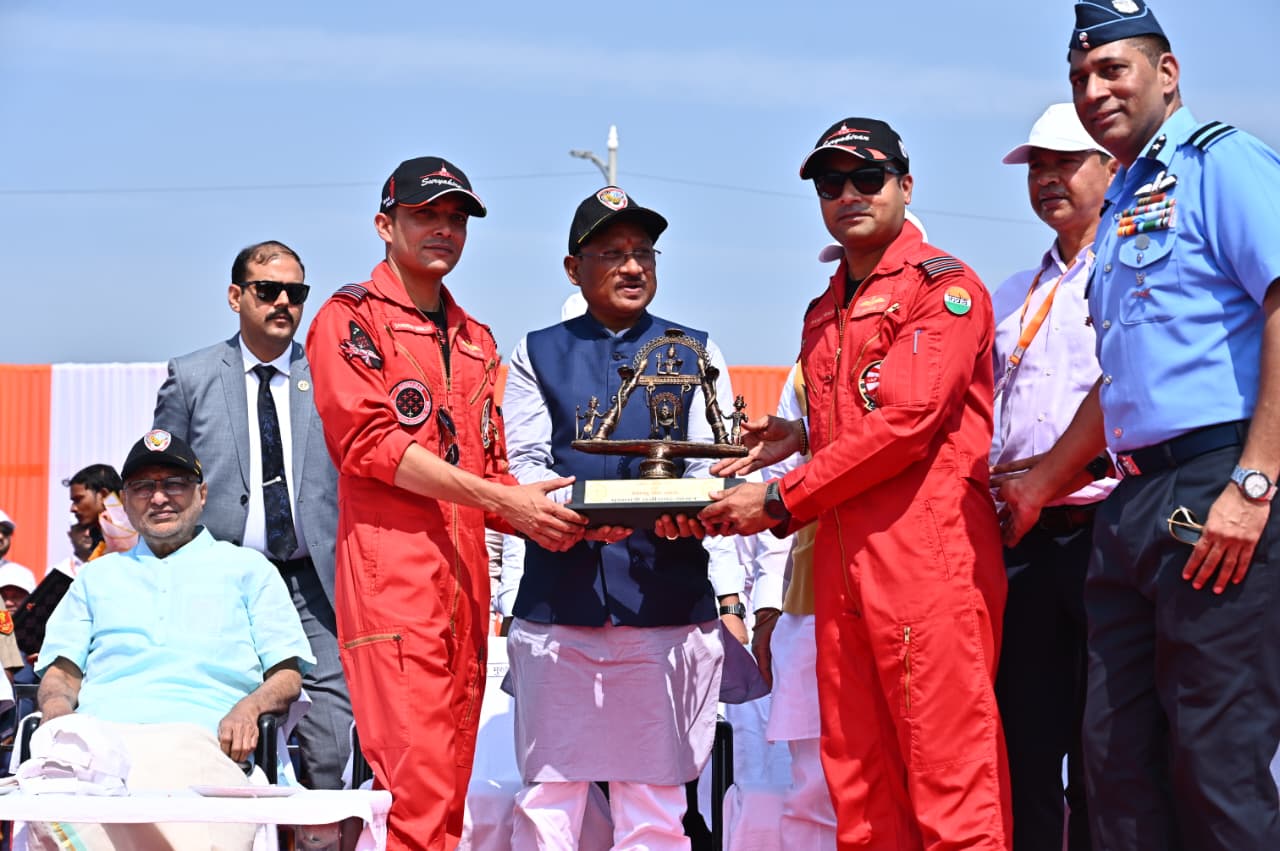 रायपुर। छत्तीसगढ़ राज्य स्थापना की 25वीं वर्षगांठ पर आज नवा रायपुर के सेंध जलाशय के ऊपर भारतीय वायु सेना की प्रतिष्ठित एरोबेटिक “सूर्यकिरण” की टीम ने रोमांचक एयर शो का प्रदर्शन किया। देश के उप राष्ट्रपति श्री सी.पी. राधाकृष्णन, राज्यपाल श्री रमेन डेका, मुख्यमंत्री विष्णु देव साय और विधानसभा अध्यक्ष डॉ. रमन सिंह के साथ हजारों लोगों ने अद्भूत और रोमांचक एयर शो का आनंद लिया। आज प्रदेशवासियों के लिए वायु सेना का एयर शो कमाल का अनुभव रहा।