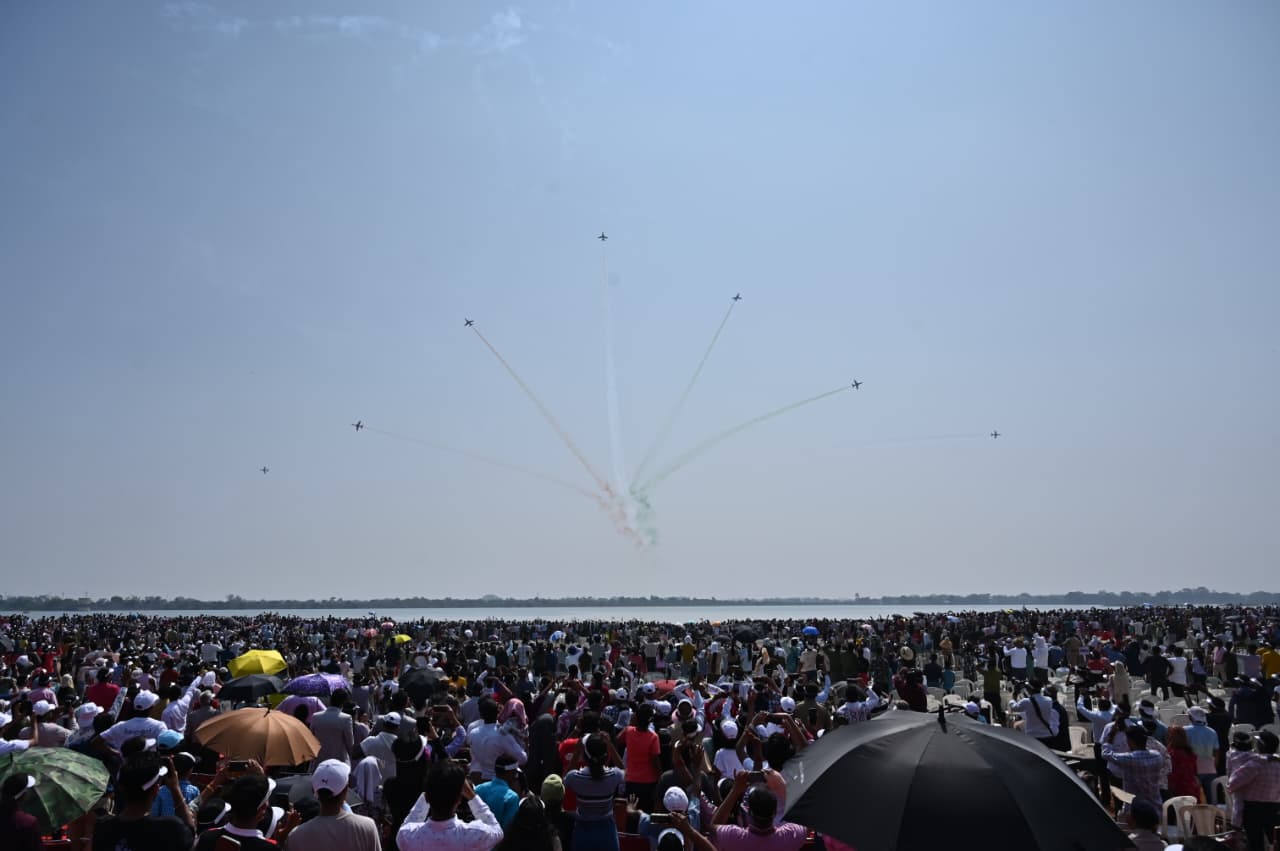 एयर शो में “सूर्यकिरण” की टीम के नौ हॉक-मार्क-123 फाइटर विमानों ने आसमान में हार्ट, डायमंड, लूप, ग्रोवर, डान लाइट, कॉम्बैट तेजस जैसे शानदार फार्मेशन बनाकर लोगों को रोमांचित किया। नीले आसमान में उड़ते लाल-सफेद जेट विमानों द्वारा तिरंगे की आकर्षक ट्रेल छोड़ने पर सेंध जलाशय परिसर तालियों और जय-हिंद के नारों से गूंज उठा। हज़ारों की संख्या में मौजूद नागरिक, युवा और बच्चे लगातार विमानों की कलाबाजियों को अपने कैमरों और मोबाइलों में कैद करते रहे।