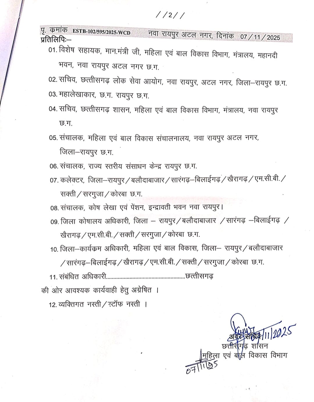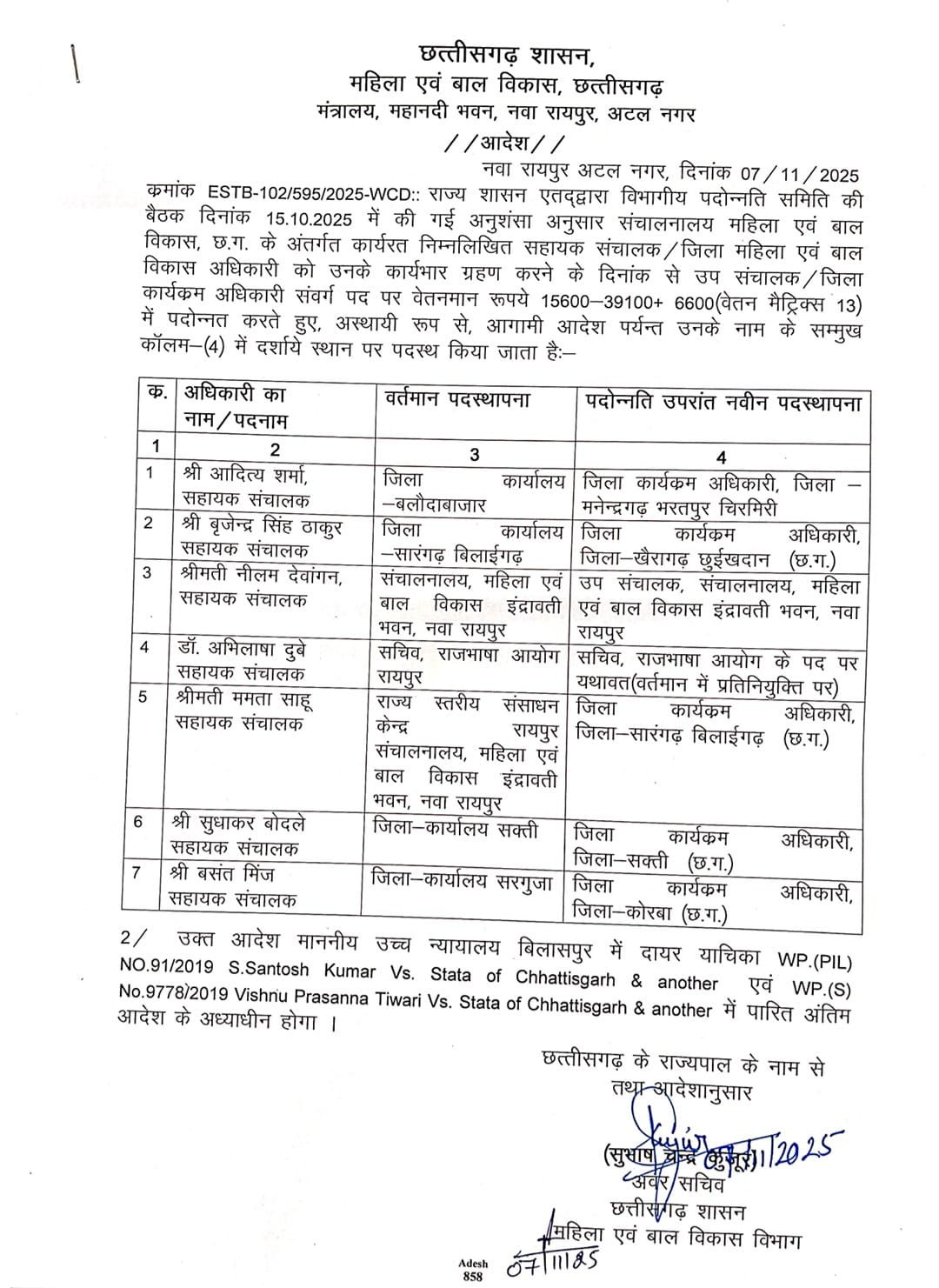 हसदेव एक्सप्रेस न्यूज रायपुर-कोरबा। साय सरकार ने महिला एवं बाल विकास विभाग में प्रमोशन के बाद नई पदस्थापना के आदेश जारी किए हैं। विभाग द्वारा जारी आदेश के अनुसार, 7 सहायक संचालकों को उपसंचालक और जिला कार्यक्रम अधिकारी (DPO) के पद पर पदोन्नत कर नई जिम्मेदारियाँ सौंपी गई हैं।
