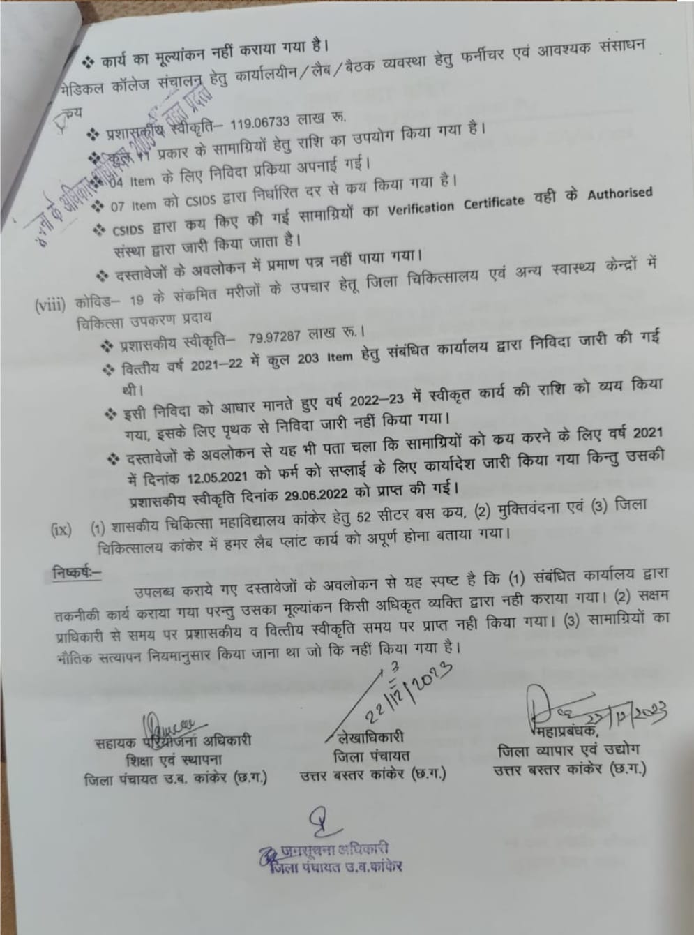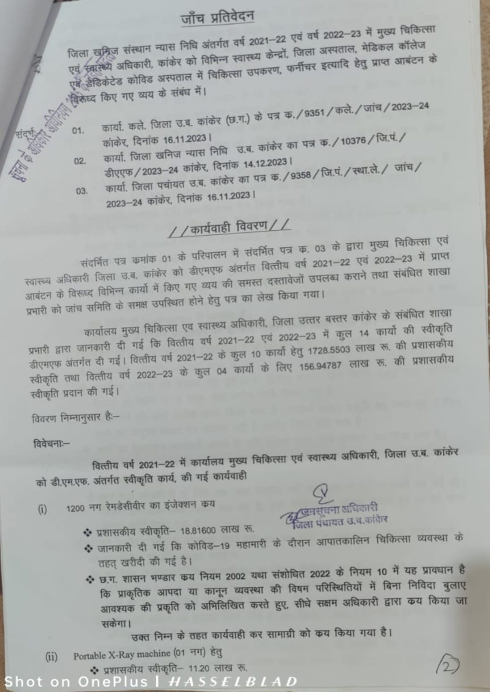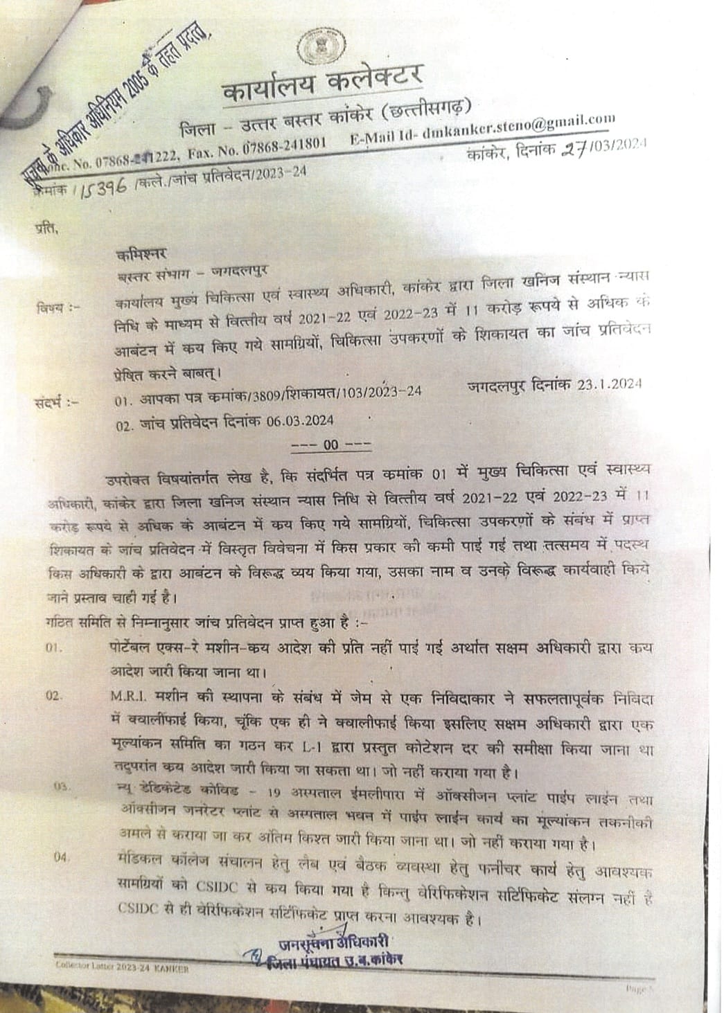 मामला उत्तर बस्तर-कांकेर जिले का है। पूर्ववर्ती कांग्रेस शासनकाल में कार्यालय मुख्य चिकित्सा एवं स्वास्थ्य अधिकारी जिला -उत्तर बस्तर -कांकेर को डीएमएफ से वित्तीय वर्ष 2021 -22 एवं 2022 -23 में विभिन्न 14 कार्यों के लिए कोरोनाकाल में उच्च प्राथमिकता के सेक्टर होने के नाते कुल 18 करोड़ 85 लाख 49 हजार 817 रुपए की प्रशासकीय स्वीकृति दी गई थी। इनमें वित्तीय वर्ष 2021 -22 के कुल 10 कार्यों के लिए 7 करोड़ 28 लाख 55 हजार 3 रुपए एवं वित्तीय वर्ष 2022 -23 में 4 कार्यों के लिए 1 करोड़ 56 लाख 94 हजार 787 रुपए की स्वीकृति प्रदान की गई थी । जिसमें 11 करोड़ रुपए से अधिक के आबंटन में सामाग्रियों ,चिकित्सा उपकरणों में अनियमितता की मिल रही शिकायतों पर प्रमुख सचिव महोदय स्वास्थ्य एवं परिवार कल्याण मंत्रालय छत्तीसगढ़ शासन को दिनांक 25 सितंबर 2023 को व्यापक लोकहित में जांच का अनुरोध किया गया था ।