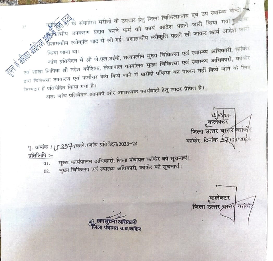 जांच प्रतिवेदन में जे .एल.उईके तत्कालीन मुख्य चिकित्सा एवं स्वास्थ्य अधिकारी ,एवं शाखा लिपिक सह प्रभारी लेखापाल नरेश कौशिक कार्यालय मुख्य चिकित्सा एवं स्वास्थ्य अधिकारी कांकेर को प्रकरण में जिम्मेदार प्रतिवेदित किया गया है। जिनके द्वारा खरीदी प्रक्रिया का पालन नहीं किया गया ।डीएमएफ के 11 करोड़ रूपए से अधिक के आबंटन में कोरोनाकाल में क्रय किए गए सामाग्रियों ,चिकित्सा उपकरणों की शिकायत से संबंधी जांच प्रतिवेदन कमिश्नर बस्तर संभाग -जगदलपुर को 23 मार्च 2024 को ही कार्यालय कलेक्टर जिला -उत्तर -बस्तर -कांकेर द्वारा भेज दिया गया था। निश्चित तौर पर उस दरम्यान लोकसभा चुनाव हेतु आदर्श आचार संहिता प्रभावशील थी। लेकिन चुनाव परिणाम आने के बाद आदर्श आचार संहिता को हटने के 2 साल बाद भी प्रकरण में आज पर्यंत दोषी अफसर एवं लेखापाल के विरुद्ध कार्रवाई नहीं की गई।प्रकरण में प्रमुख सचिव स्वास्थ्य एवं परिवार कल्याण मंत्रालय ,मुख्यमंत्री निवास से लेकर प्रधानमंत्री कार्यालय तक शिकायत एवं ध्यानाकर्षण पत्र भेजने के उपरांत भी जिम्मेदारों पर आज पर्यन्त कार्रवाई नहीं हो सकी। जिससे दोषी अफसर अधिकारियों के राजनीतिक रसूख का भी पता चलता है। प्रकरण में पीएमओ को पत्र क्रमांक 6703 दिनांक 16-04 -2025 को पत्र व्यवहार के बाद भी कार्रवाई नहीं होने पर पत्र क्रमांक 6709 दिनांक 25 /07/2025 को ध्यानाकर्षण पत्र के बावजूदजिम्मेदारों पर आज