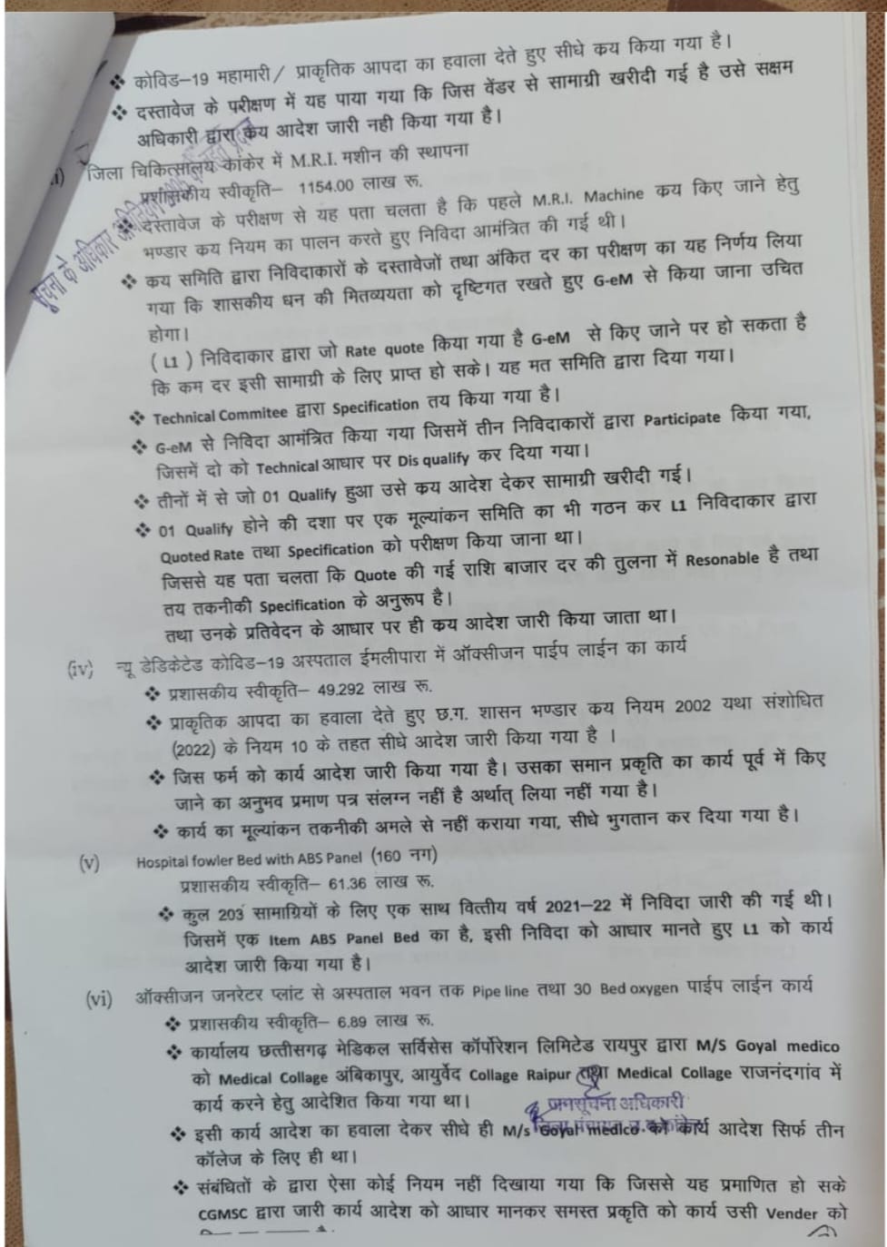 👉5 .कोविड -19 के संक्रमित मरीजों के उपचार हेतु जिला चिकित्सालय एवं अन्य स्वास्थ्य केंद्रों में चिकित्सा उपकरण प्रदाय के लिए 79 लाख 97 हजार 287 रुपए की प्रशासकीय स्वीकृति प्राप्त हुई थी । वित्तीय वर्ष 2021 -22 में कुल 203 सामाग्रियों हेतु संबंधित कार्यालय द्वारा निविदा जारी की गई थी। इसी निविदा को आधार मानते हुए वर्ष 2022 -23 में स्वीकृत कार्य की राशि को व्यय किया गया,इसके लिए पृथक से निविदा जारी नहीं किया गया। दस्तावेजों के अवलोकन के दौरान जांच समिति ने पाया कि सामाग्रियों को क्रय करने के लिए वर्ष 2021 में दिनांक 12 .05.2021 को फर्म को सप्लाई के लिए कार्यादेश जारी किया गया,किंतु उसकी प्रशासकीय स्वीकृति एक साल डेढ़ माह उपरांत 29 .06.2022 को प्राप्त की गई । जबकि नियमानुसार प्रशासकीय स्वीकृति पहले ली जाकर कार्यादेश जारी किया जाना था।