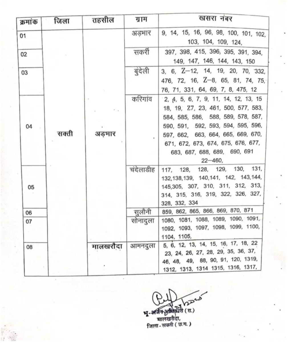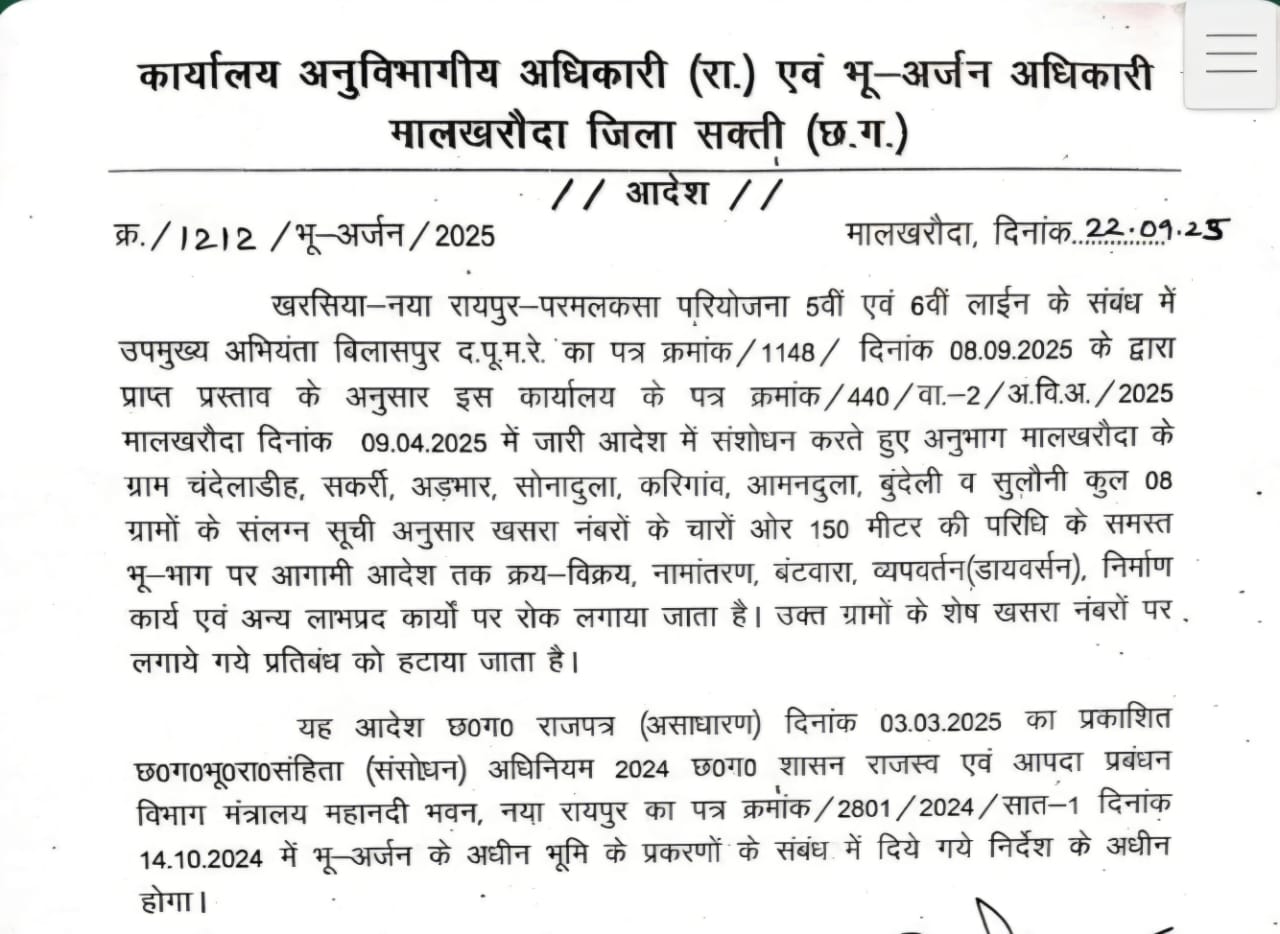 नए आदेश के तहत अनुभाग मालखरौदा के ग्राम चंदेलाडीह, सकरी, अड़भार, सोनादुला, करिगांव, आमनदुला, बुंदेली और सुलौनी के चयनित खसरा नंबरों के चारों ओर 150 मीटर दायरे में जमीन से जुड़े सभी कार्यों पर रोक लगा दी गई है। इसमें क्रय-विक्रय, नामांतरण, बंटवारा, डायवर्सन, निर्माण कार्य और अन्य सभी लाभप्रद गतिविधियां शामिल हैं।