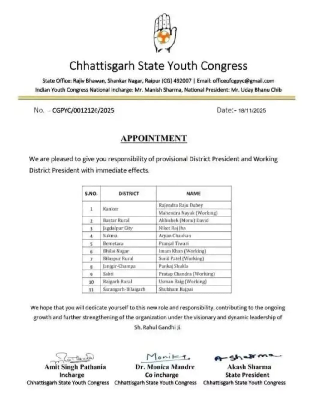 रायपुर। छत्तीसगढ़ युवा कांग्रेस ने संगठन को नई ऊर्जा देने 11 जिलों में नए जिलाध्यक्षों की नियुक्ति की है। प्रदेश नेतृत्व ने इसकी आधिकारिक सूची जारी कर दी है।