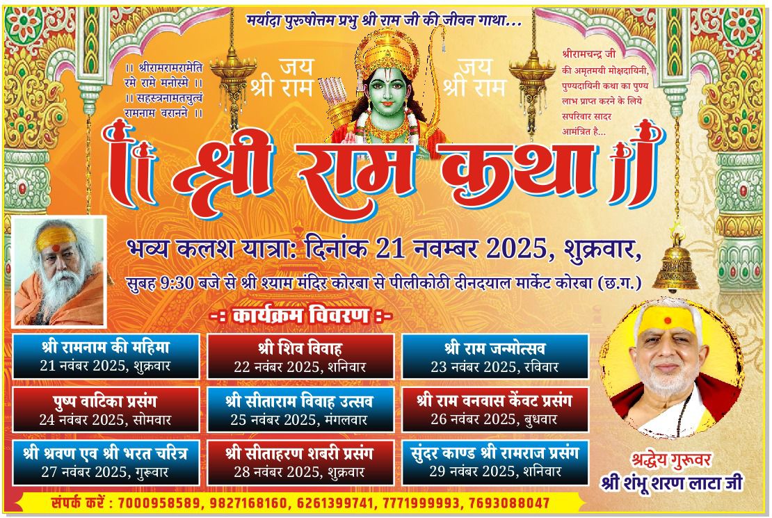 कोरबा। नगर में धार्मिक और आध्यात्मिक माहौल को सुदृढ़ करने के उद्देश्य से इस वर्ष श्री राम कथा का भव्य आयोजन 21 नवंबर से 29 नवंबर तक पीलीकोठी परिसर में किया जाएगा। समस्त कोरबा नगरवासियों की ओर से आयोजित इस कार्यक्रम में प्रतिदिन बड़ी संख्या में श्रद्धालुओं के पहुँचने की संभावना है।