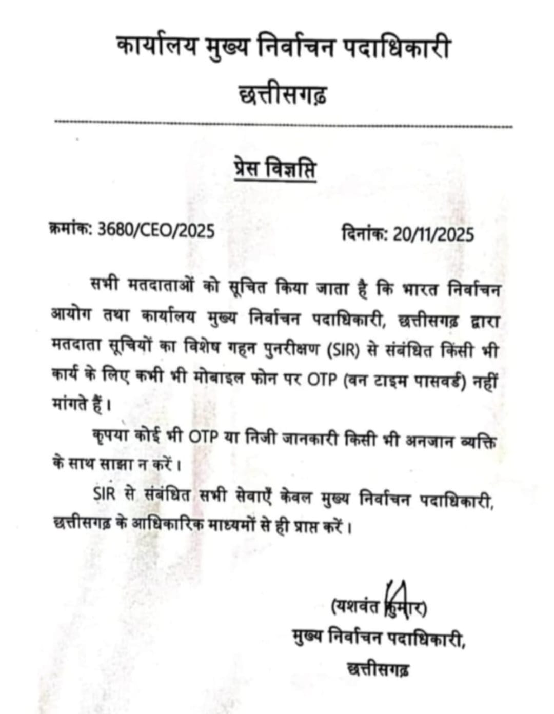 चूंकि कई राज्यों में इस फॉर्म के नाम पर नई OTP ठगी सामने आ रही है, इसलिए छत्तीसगढ़ निर्वाचन कार्यालय ने पहले ही अलर्ट जारी करते हुए कहा है, आपकी सतर्कता ही आपकी सुरक्षा है।