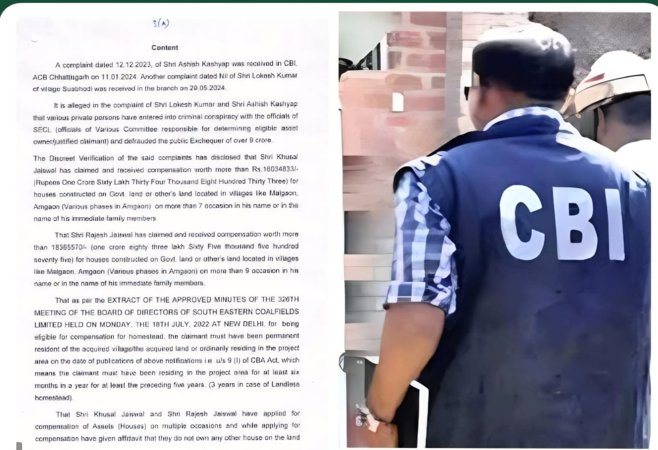 बता दें कि कई निजी लोगों के द्वारा SECL के अधिकारियों (पात्र संपत्ति के मालिक/उचित दावेदार का निर्धारण करने के लिए ज़िम्मेदार विभिन्न समितियों के अधिकारी) के साथ आपराधिक साज़िश कर सरकारी खजाने से 9 करोड़ से ज़्यादा की धोखाधड़ी की शिकायतों के विवेकपूर्ण वेरिफ़िकेशन से ACB/CBI को पता चला है कि खुशाल जायसवाल ने सरकारी ज़मीन पर बने घरों के लिए 1 करोड़ 60 लाख रुपये से ज़्यादा का मुआवज़ा लिया और पाया है।