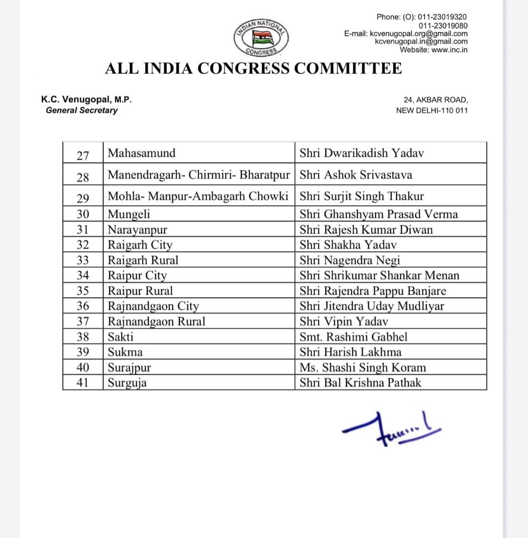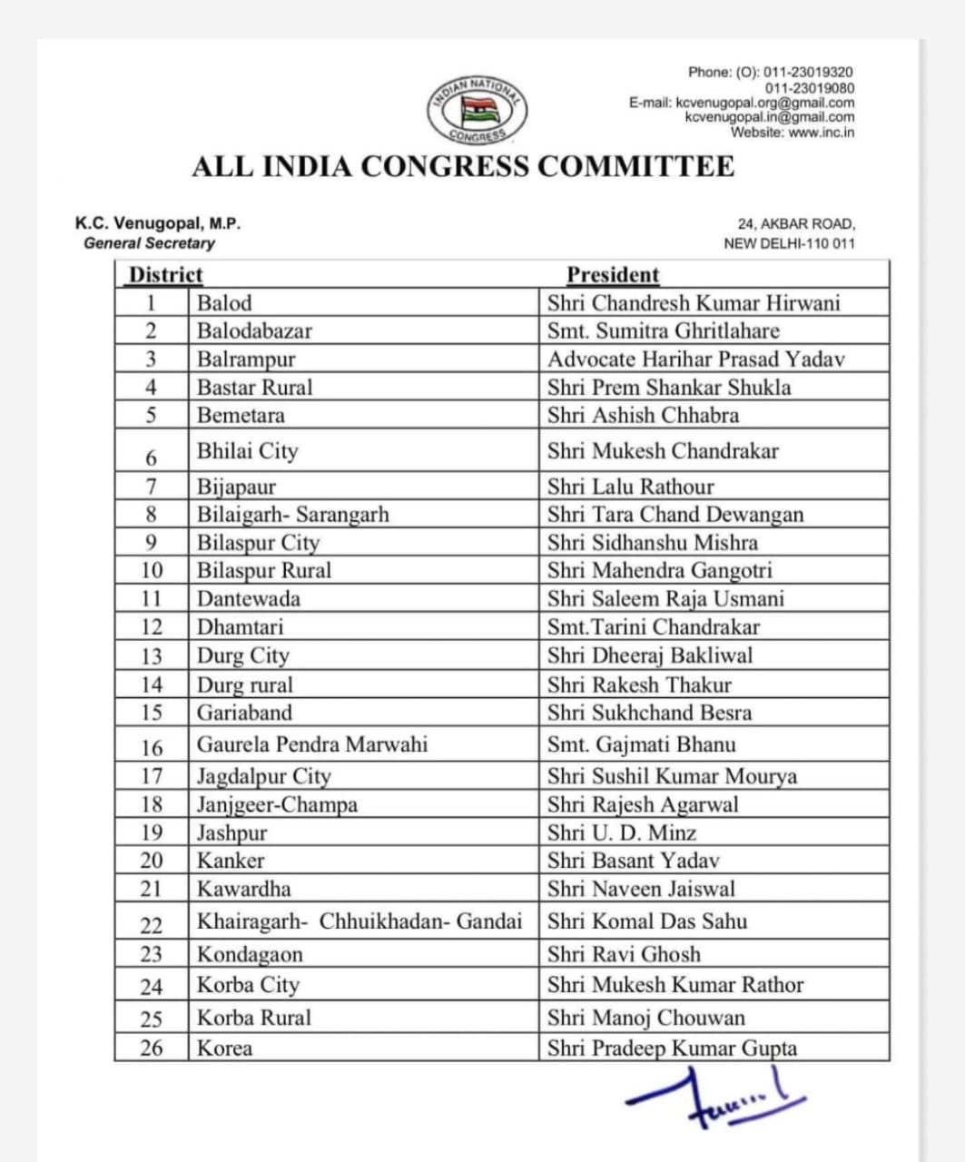 बालोद में चंद्रेश कुमार हिरवानी, बलौदाबाजार में सुमित्रा घृतलहरे, बलरामपुर में हरिहर प्रसाद यादव और बस्तर ग्रामीण के लिए प्रेम शंकर शुक्ला को जिलाध्यक्ष नियुक्त किया गया है। दंतेवाड़ा में सलीम राजा उस्मान, धमतरी में तारिणी चंद्राकरए दुर्ग शहर में धीरज बाकलीवाल,कोंडागांव में रवि घोष और कोरबा शहर में मुकेश कुमार राठौर को जिम्मेदारी मिली है।
