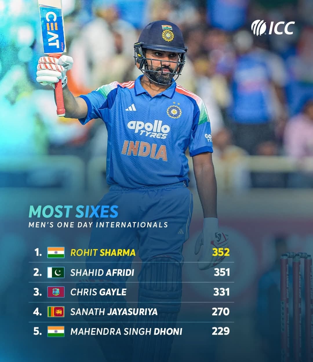 अब रोहित के नाम ODI करियर में 352 छक्के दर्ज हो चुके हैं। उन्होंने यह उपलब्धि सिर्फ 269 पारियों में हासिल की, जबकि अफरीदी ने 369 पारियों में 351 छक्के जड़े थे। यानी रोहित ने 100 पारियां कम खेलकर अफरीदी को पछाड़ दिया।