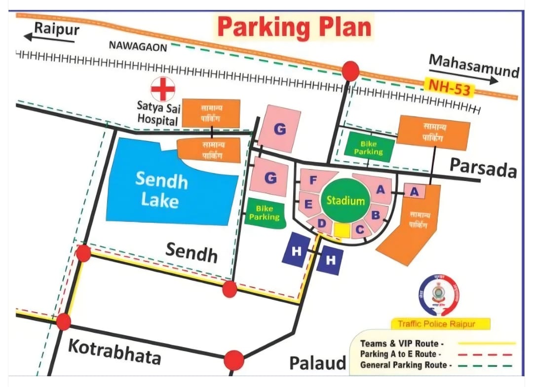 - दुर्ग-भिलाई की ओर से आने वाले दर्शकों के लिए मार्ग व्यवस्था:- दुर्ग-भिलाई की ओर से आने वाले दर्शक टाटीबंध से रिंग रोड 01 होकर पचपेढ़ीनाका, तेलीबांधा थाना तिराहा नेशनल हाइवे क्र-53 होकर सेरीखेड़ी ओव्हरब्रीज से नया रायपुर मार्ग होकर स्टेडियम तिराहा से सांई अस्पताल रोड होकर सत्यसांई अस्पताल पार्किंग व सेंध तालाब पार्किग में अपना वाहन पार्क कर स्टेडियम पैदल पहुंचेगे।