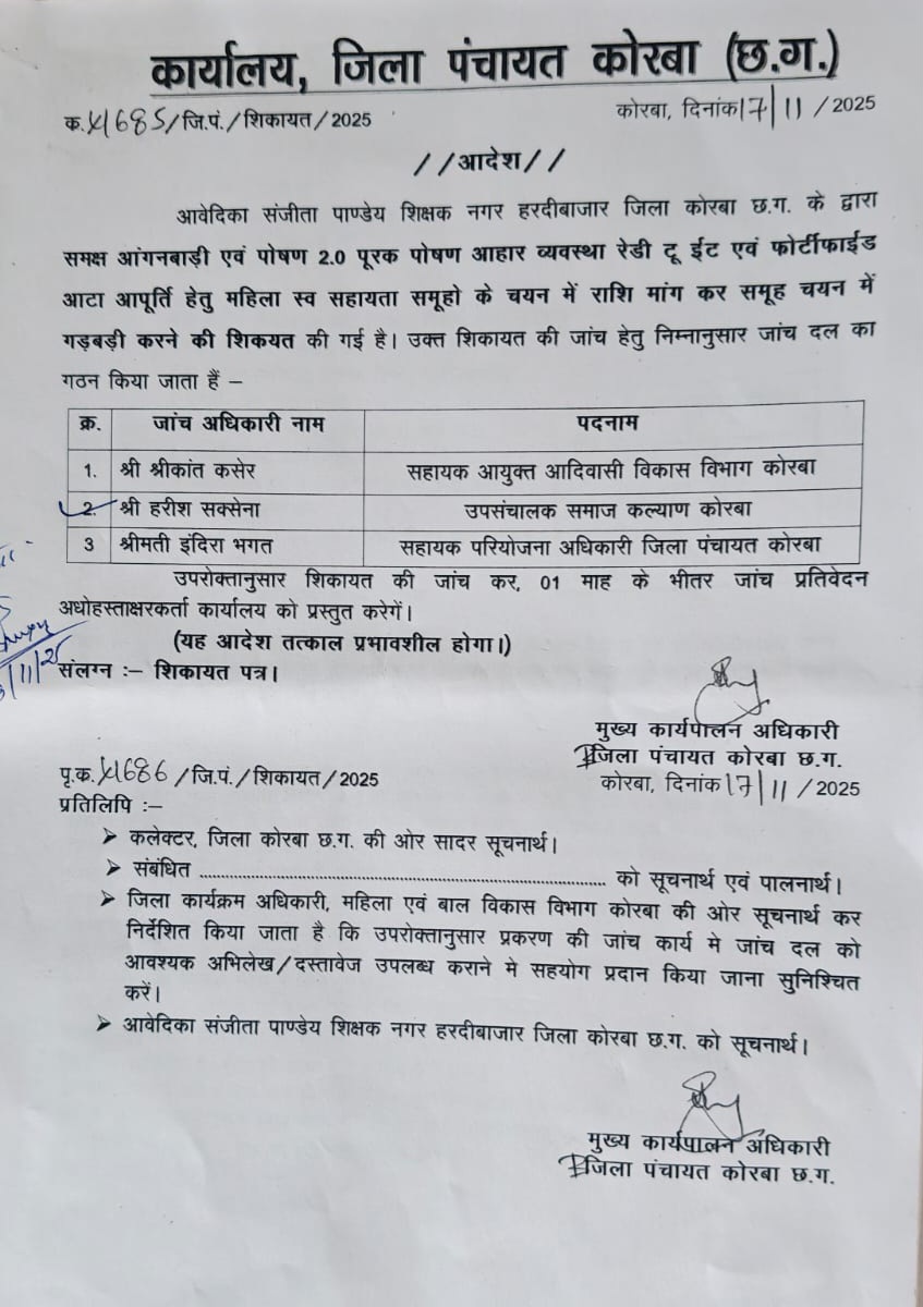 शिकायतकर्ता आवेदिका संजीता पाण्डेय शिक्षक नगर हरदीबाजार ने समूह चयन में राशि की मांग कर चयन में अनियमितता बरतने की शिकायत की है। मामले में जिला स्तर पर न्याय नहीं मिलने पर प्रधानमंत्री कार्यालय तक शिकायत किए जाने की जानकारी मिल रही। जिसके बाद हरकत में आए जिला प्रशासन ने प्रकरण में 3 सदस्ययीय जांच समिति गठित कर दी है। जिला पंचायत सीईओ द्वारा गठित जांच समिति में आदिवासी विकास विभाग के सहायक आयुक्त श्रीकांत कसेर ,समाज कल्याण विभाग के उप संचालक हरीश सक्सेना ,जिला पंचायत कोरबा के सहायक परियोजना अधिकारी हरीश सक्सेना,जिला पंचायत कोरबा के सहायक परियोजना अधिकारी श्रीमती इंदिरा भगत शामिल हैं।