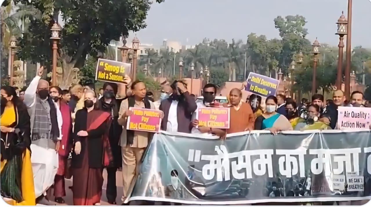 दिल्ली । संसद के शीतकाली सत्र के चौथे दिन विपक्ष ने वायु प्रदूषण का मुद्दा उठाया। ‘INDIA’ ब्लॉक के नेताओं ने संसद परिसर में दिल्ली में घटती वायु गुणवत्ता को लेकर विरोध प्रदर्शन किया। इस दौरान कई वरिष्ठ नेताओं ने हिस्सा लिया।