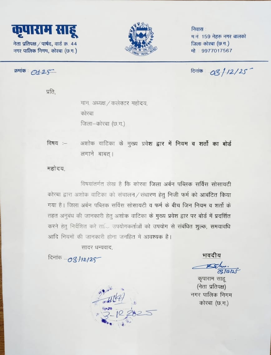 कोरबा । नगर पालिक निगम कोरबा के नेताप्रतिपक्ष कृपाराम साहू ने कलेक्टर को ज्ञापन सौंपकर मांग की है कि जनहित में अशोक वाटिका के मुख्य द्वार में नियम व शर्तों का बोर्ड लगाने संबंधित अधिकारी को निर्देशित करें।
