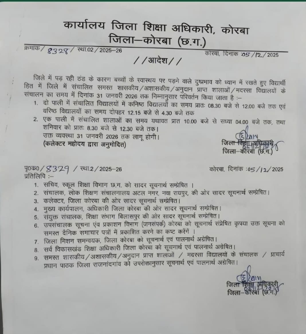 कोरबा जिले में बढ़ती ठंड के बीच यह आदेश बच्चों की सुरक्षा और स्वास्थ्य को ध्यान में रखकर लिया गया अहम फैसला माना जा रहा है।