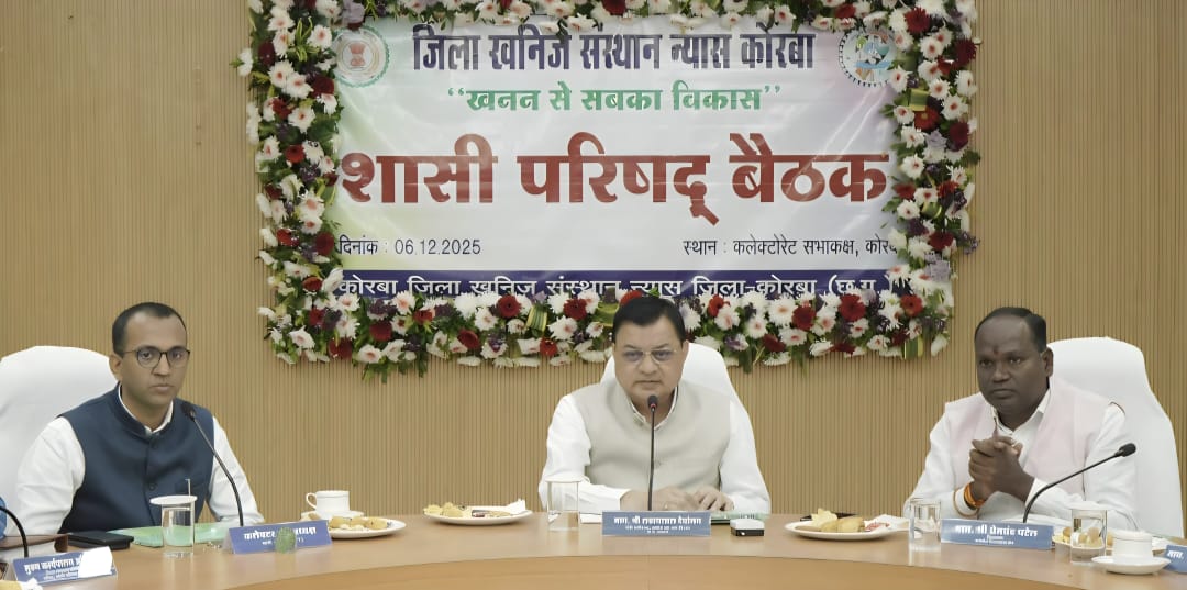 कोरबा। छत्तीसगढ़ शासन के वाणिज्य, उद्योग, आबकारी, सार्वजनिक उपक्रम एवं श्रम मंत्री लखनलाल देवांगन के मुख्य आतिथ्य में आज कलेक्ट्रेट सभाकक्ष में जिला खनिज संस्थान न्यास कोरबा की शासी परिषद की बैठक आयोजित हुई। बैठक में वित्तीय वर्ष 2025-26 के दौरान स्वीकृत कार्यों की प्रगति, किए गए कार्यों की कार्योत्तर स्वीकृति तथा आगामी वित्तीय वर्ष की कार्ययोजना को अनुमोदन हेतु प्रस्तुत किया गया।इस अवसर पर विधायक कटघोरा प्रेमचंद पटेल, विधायक पाली-तानाखार क्षेत्र तुलेश्वर सिंह मरकाम, विधायक रामपुर के प्रतिनिधि, जिला पंचायत अध्यक्ष डॉ. पवन कुमार सिंह, महापौर श्रीमती संजू देवी राजपूत सहित अन्य जनप्रतिनिधि उपस्थित रहे, जबकि पदेन अध्यक्ष कलेक्टर श्री अजीत वसंत, वनमंडलाधिकारी कोरबा श्रीमती प्रेमलता यादव, कटघोरा के डीएफओ कुमार निशांत, आयुक्त नगर निगम आशुतोष पांडेय, जिला पंचायत सीईओ दिनेश नाग, सांसद-विधायक प्रतिनिधि, अपर कलेक्टर देवेन्द्र पटेल, संयुक्त कलेक्टर श्रीमती माधुरी सोम, एसडीएम कोरबा सरोज महिलांगे सहित अन्य विभागीय अधिकारी बैठक में सम्मिलित हुए।